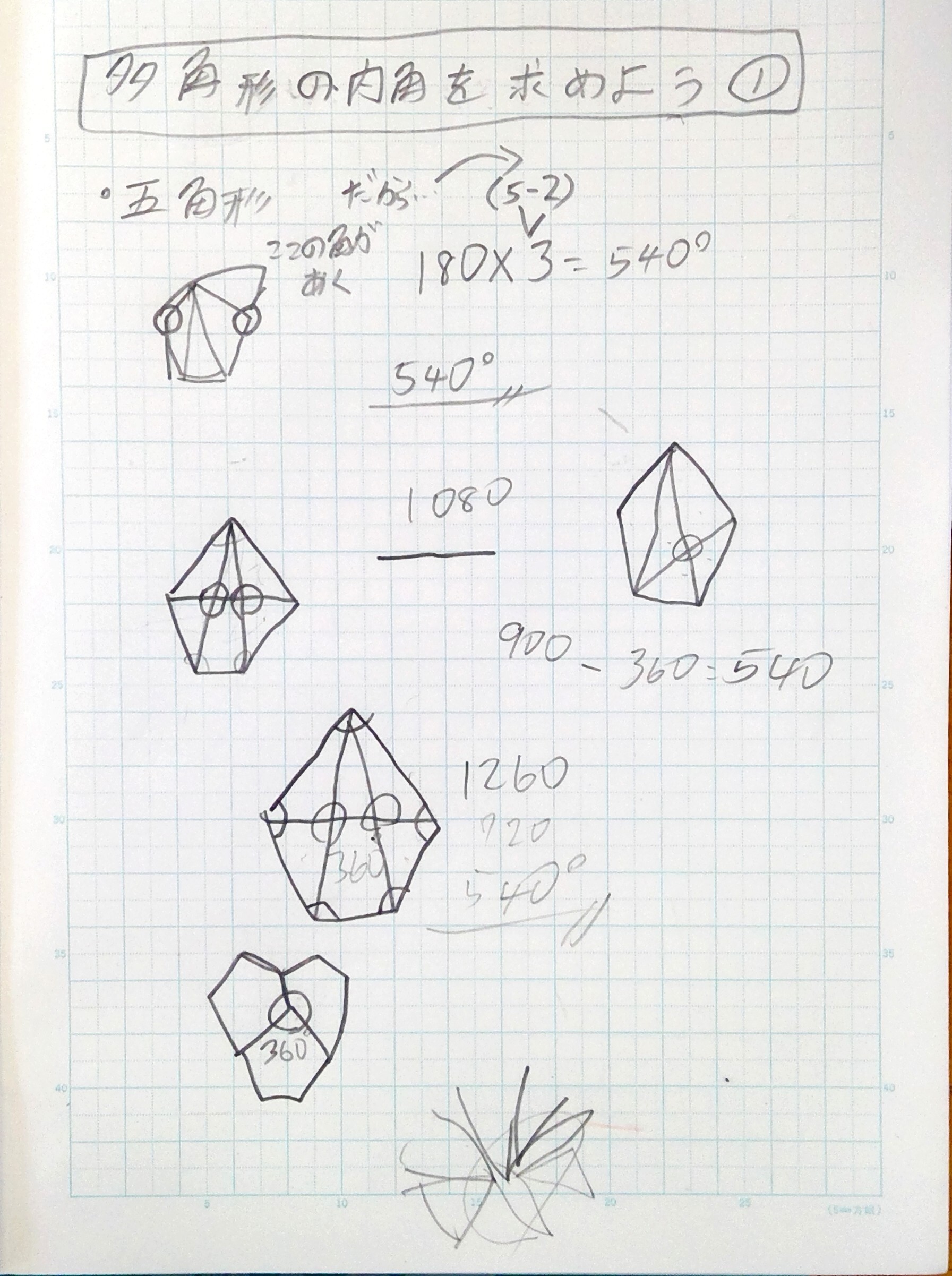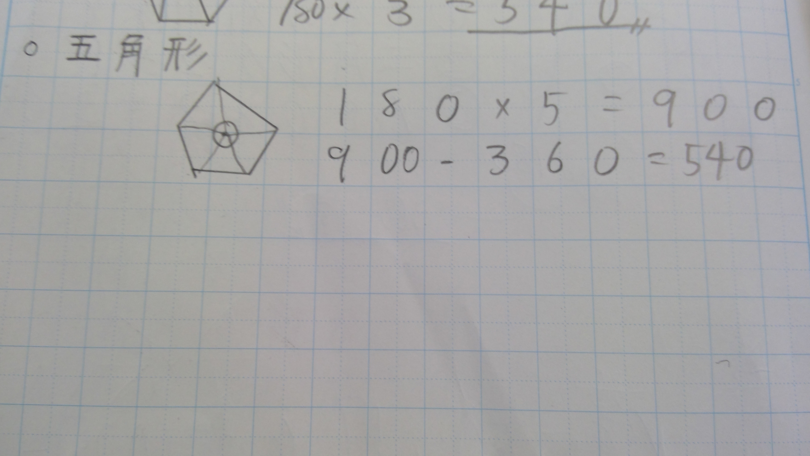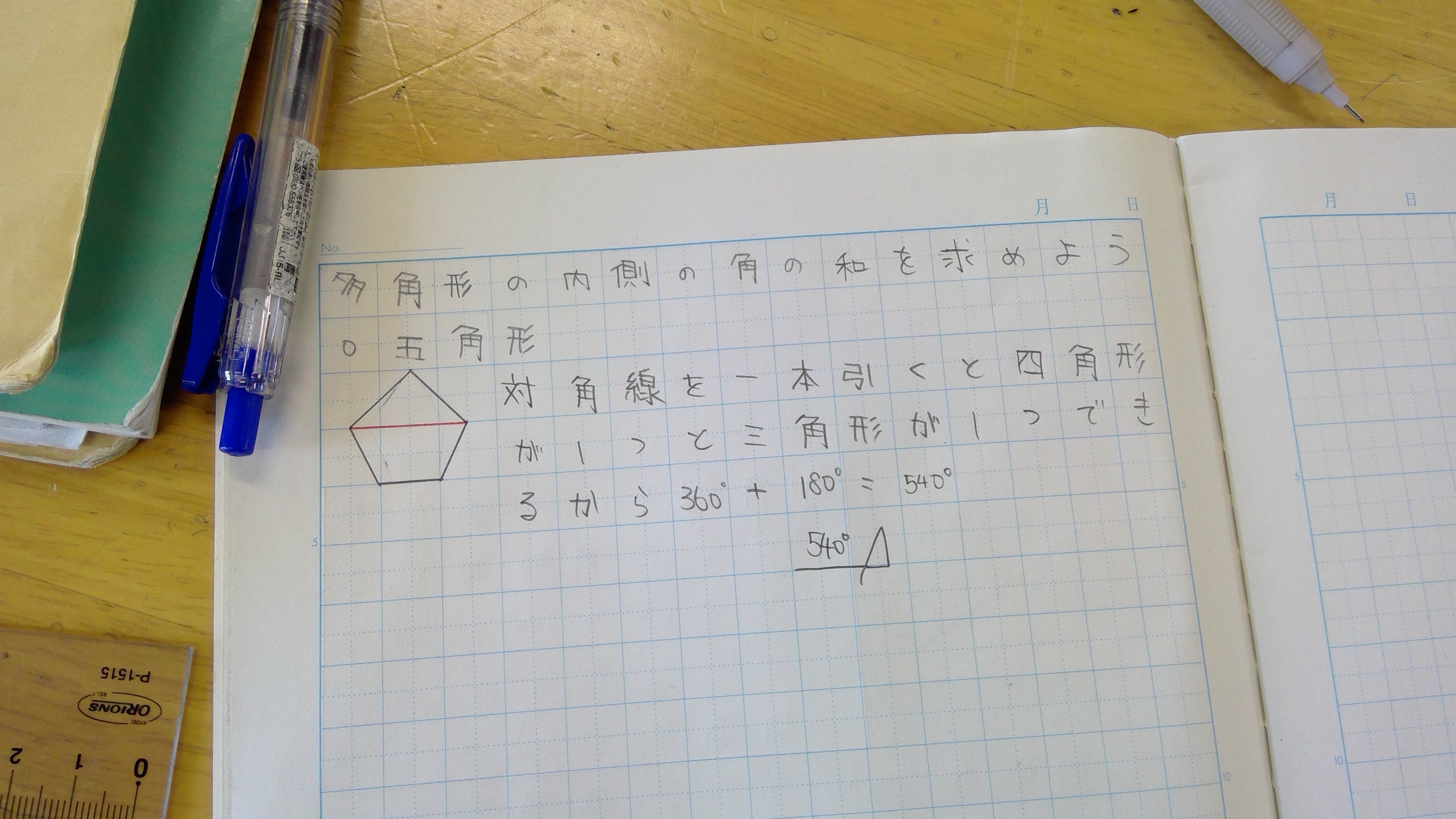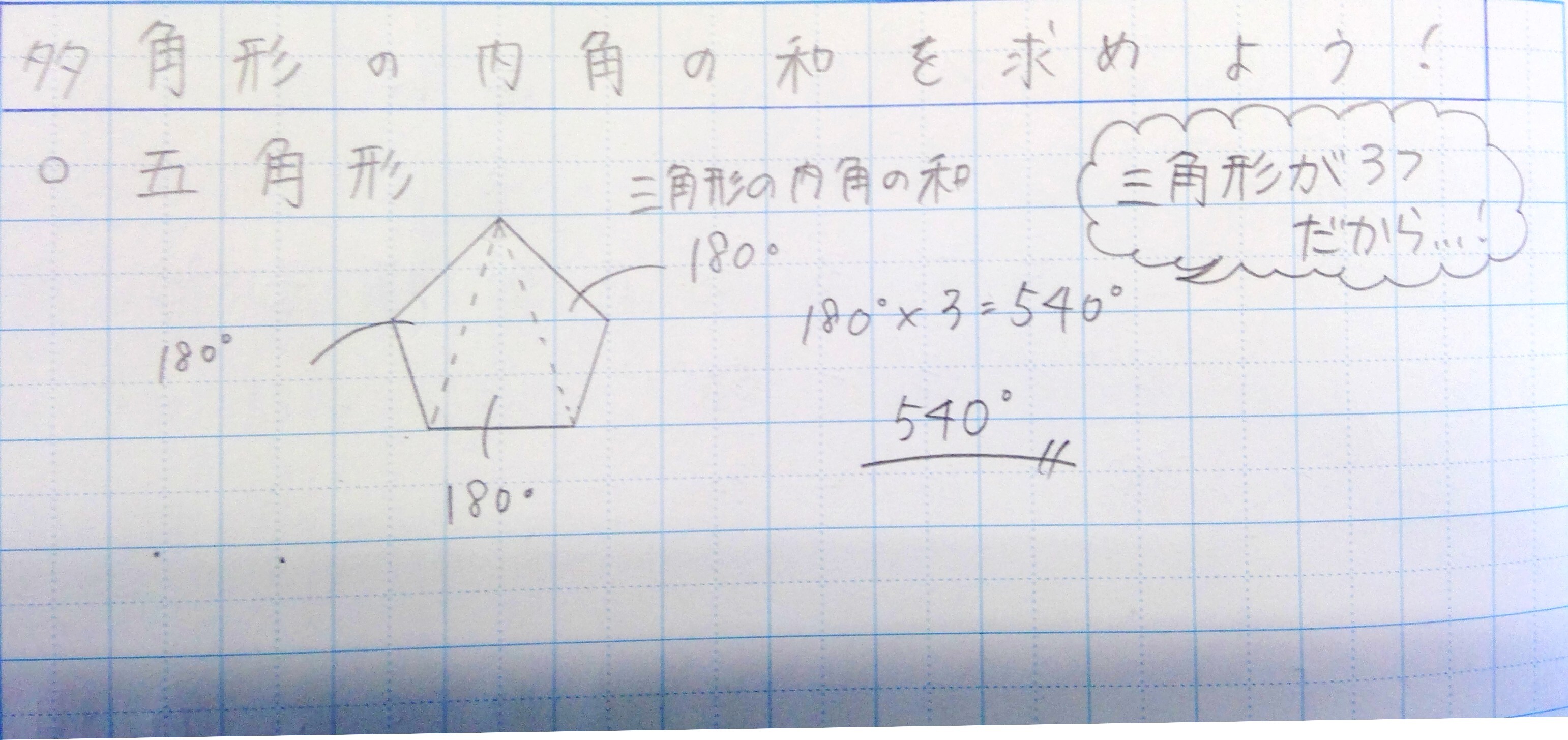 五角形の内角の和が540度であることをただ覚えるのではなく、なぜそうなるのかを自分の言葉で説明しようとする姿勢が見られました。