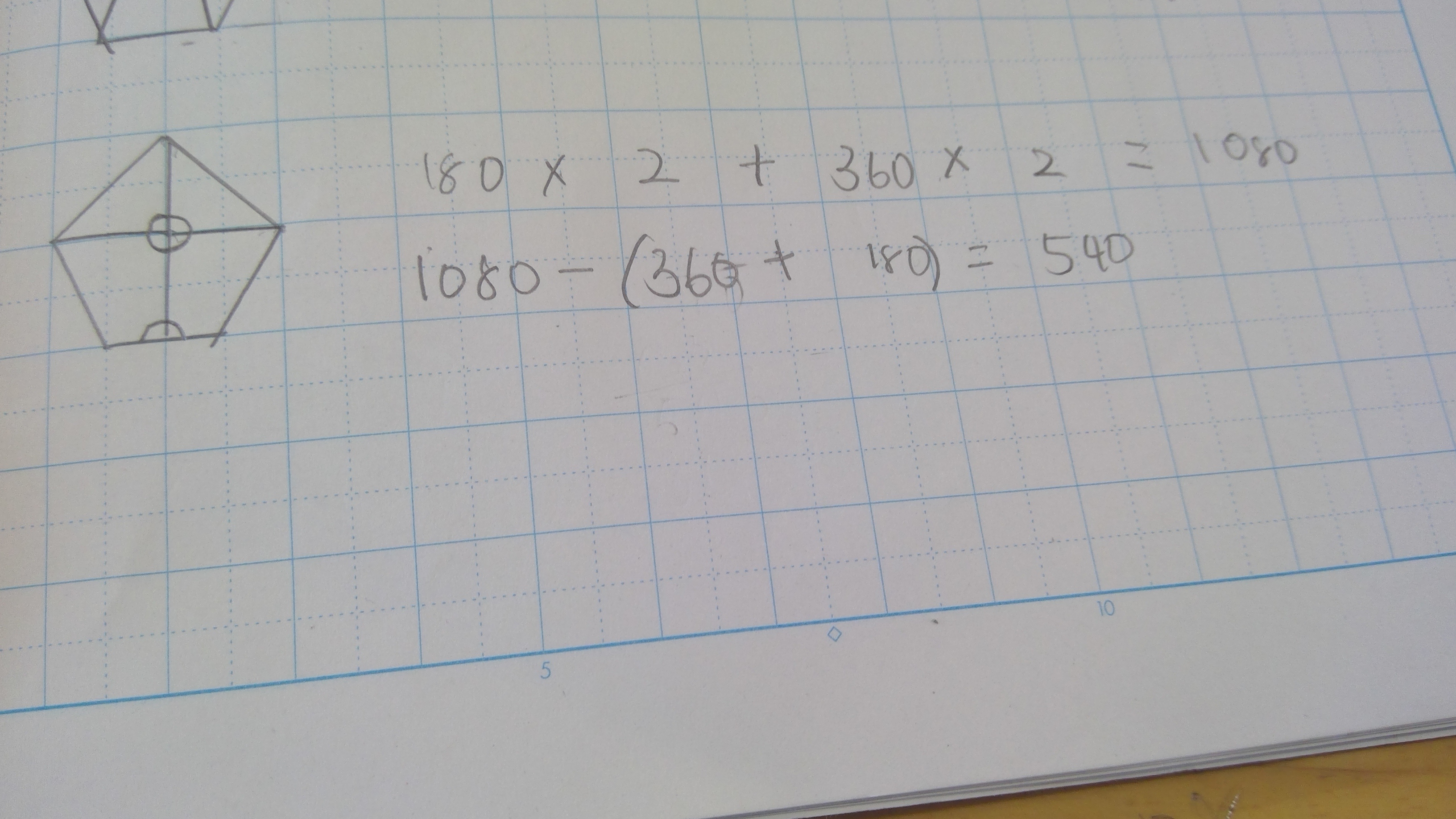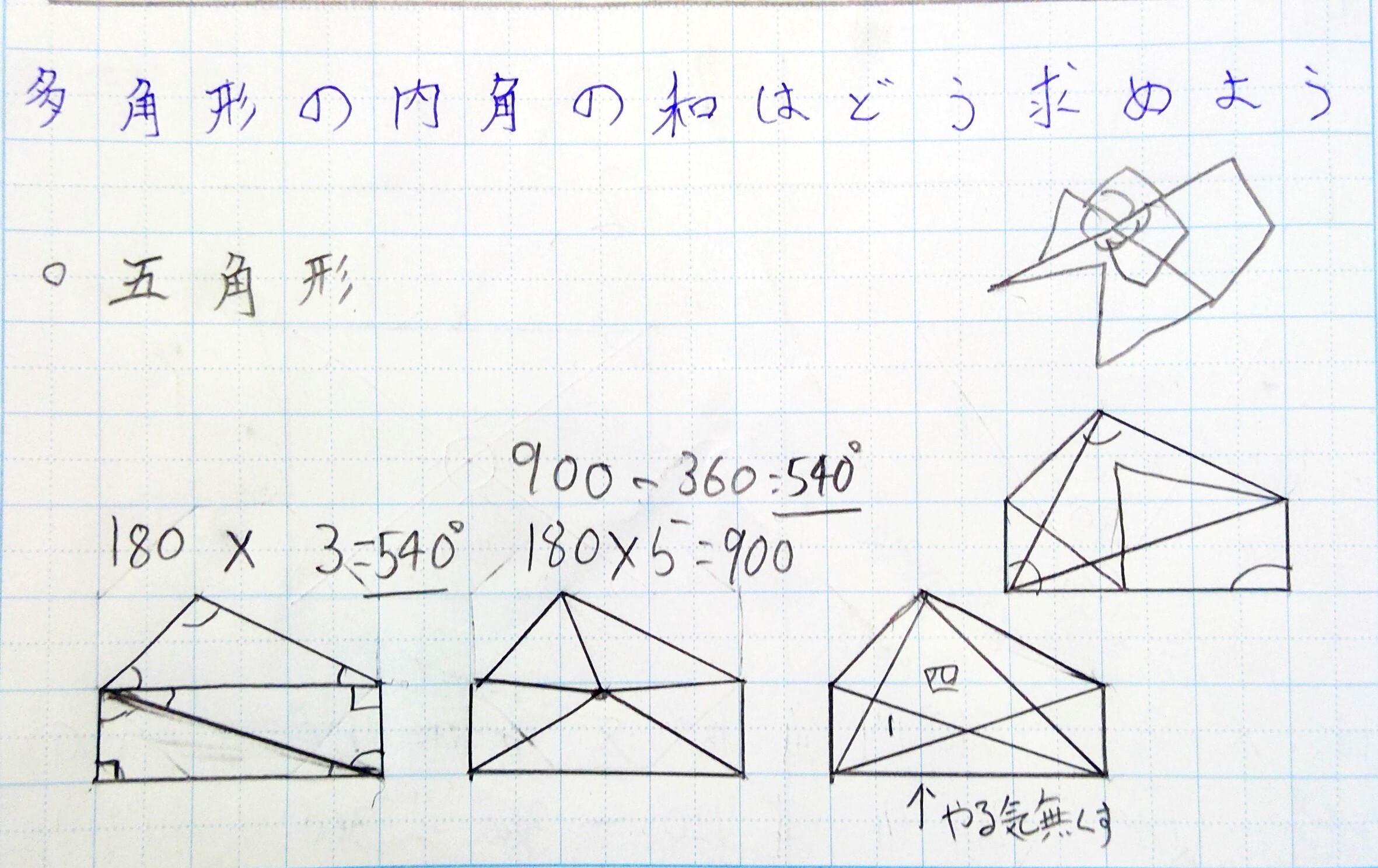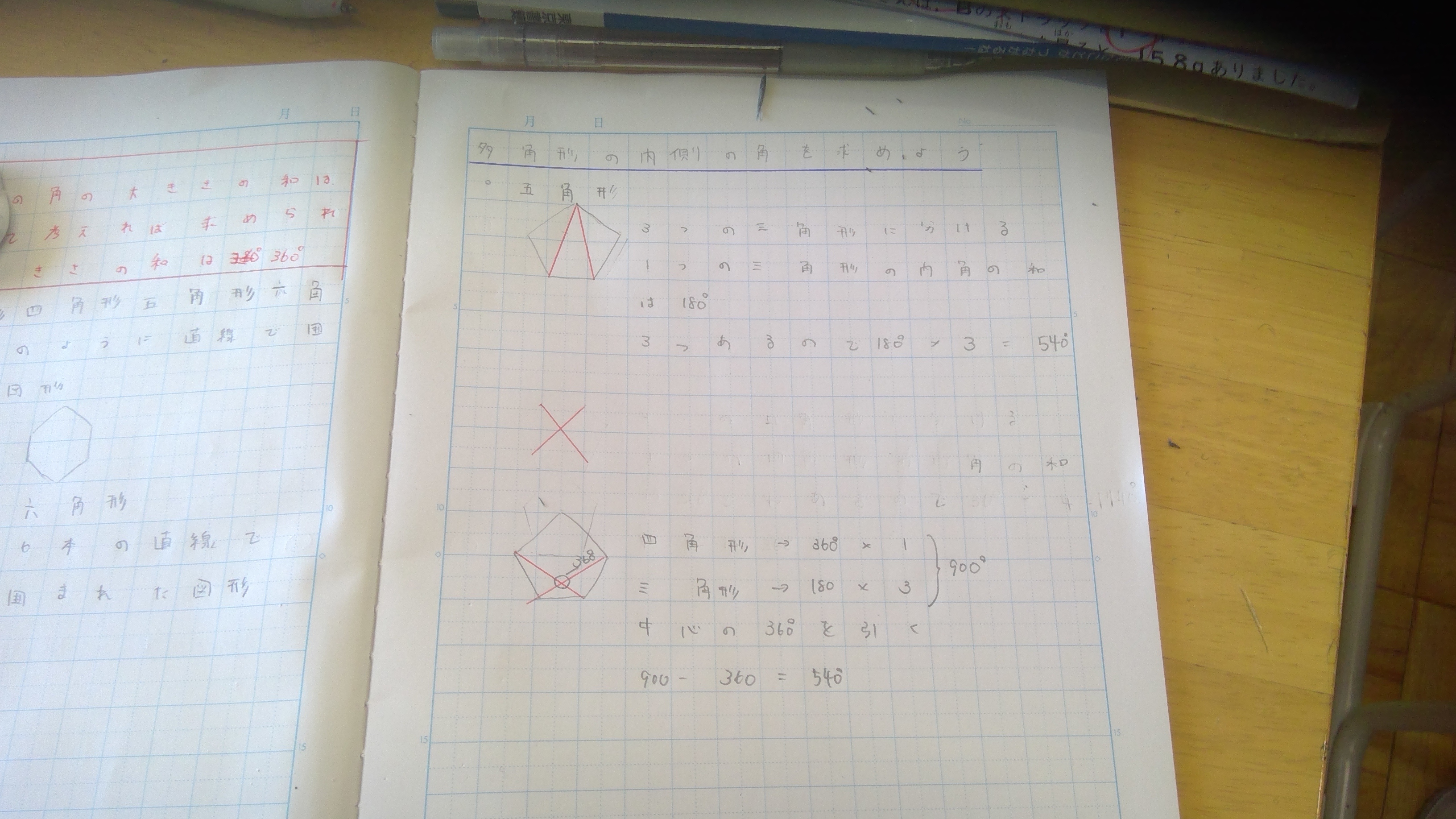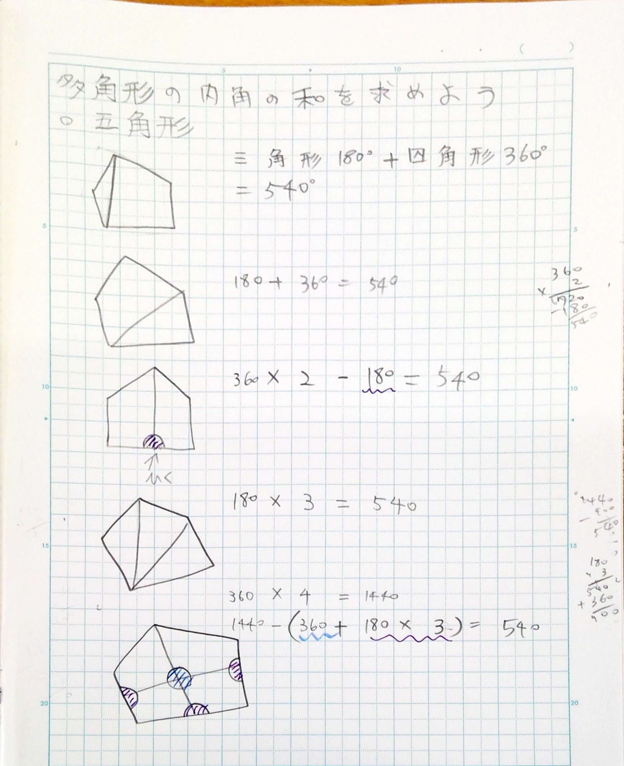五角形の内角の和が540度であることをただ覚えるのではなく、なぜそうなるのかを自分の言葉で説明しようとする姿勢が見られました。