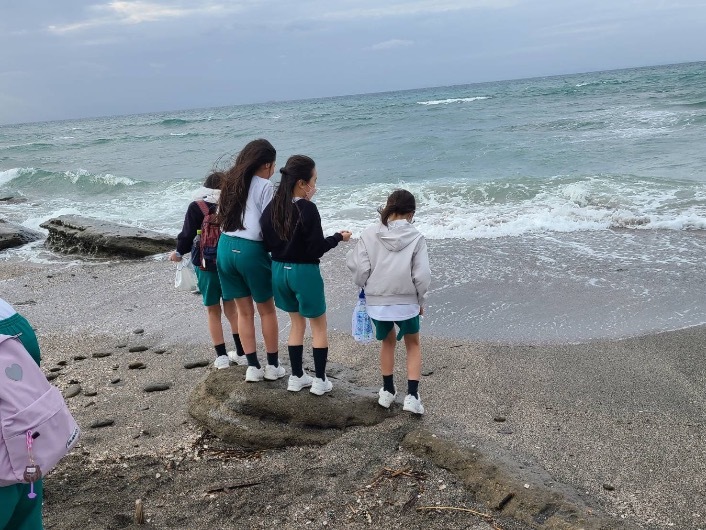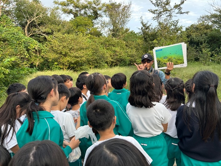 ガイドさんのお話をしっかりと聞き、沖ノ島の特徴や見つけられる貝がらについて学びました。