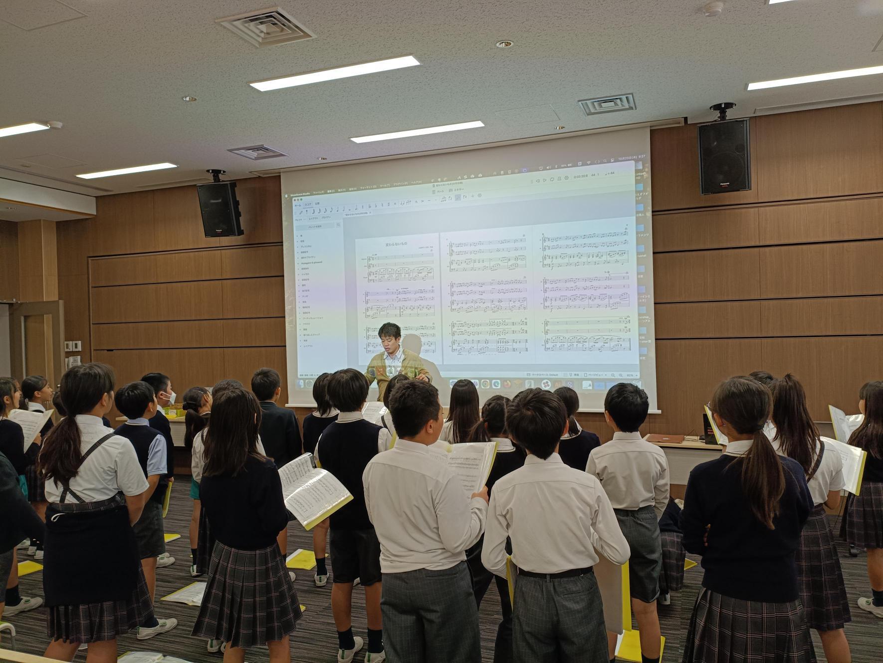 練習の前半は、パートごとに分かれて自分たちの音をしっかり確認し、後半では全体で合わせました。最初のころに比べて、ひとりひとりの声が自信をもって出せるようになり、教室にきれいな歌声が広がってくるようになりました。回を重ねるごとに、子どもたちの成長を感じます。