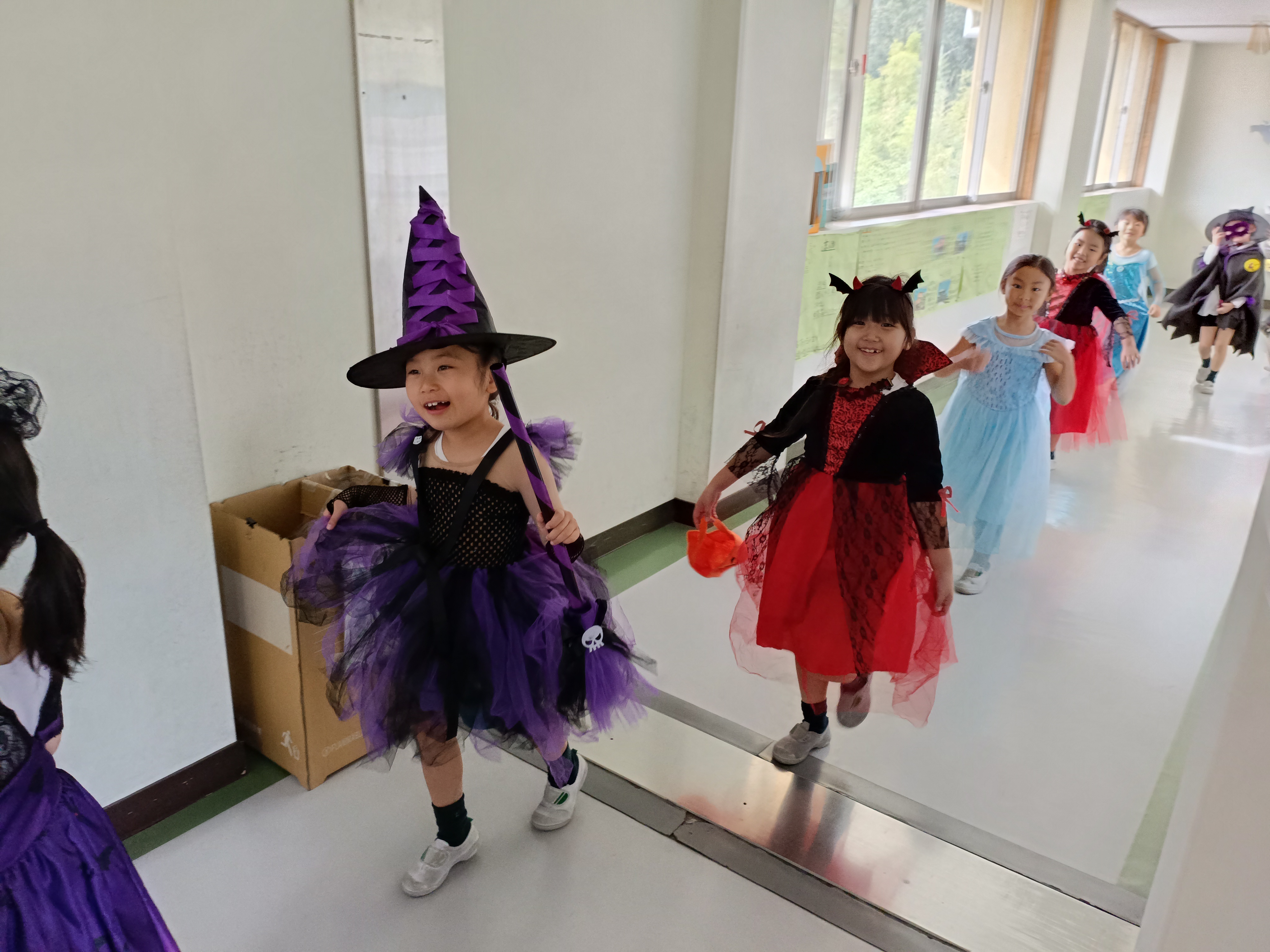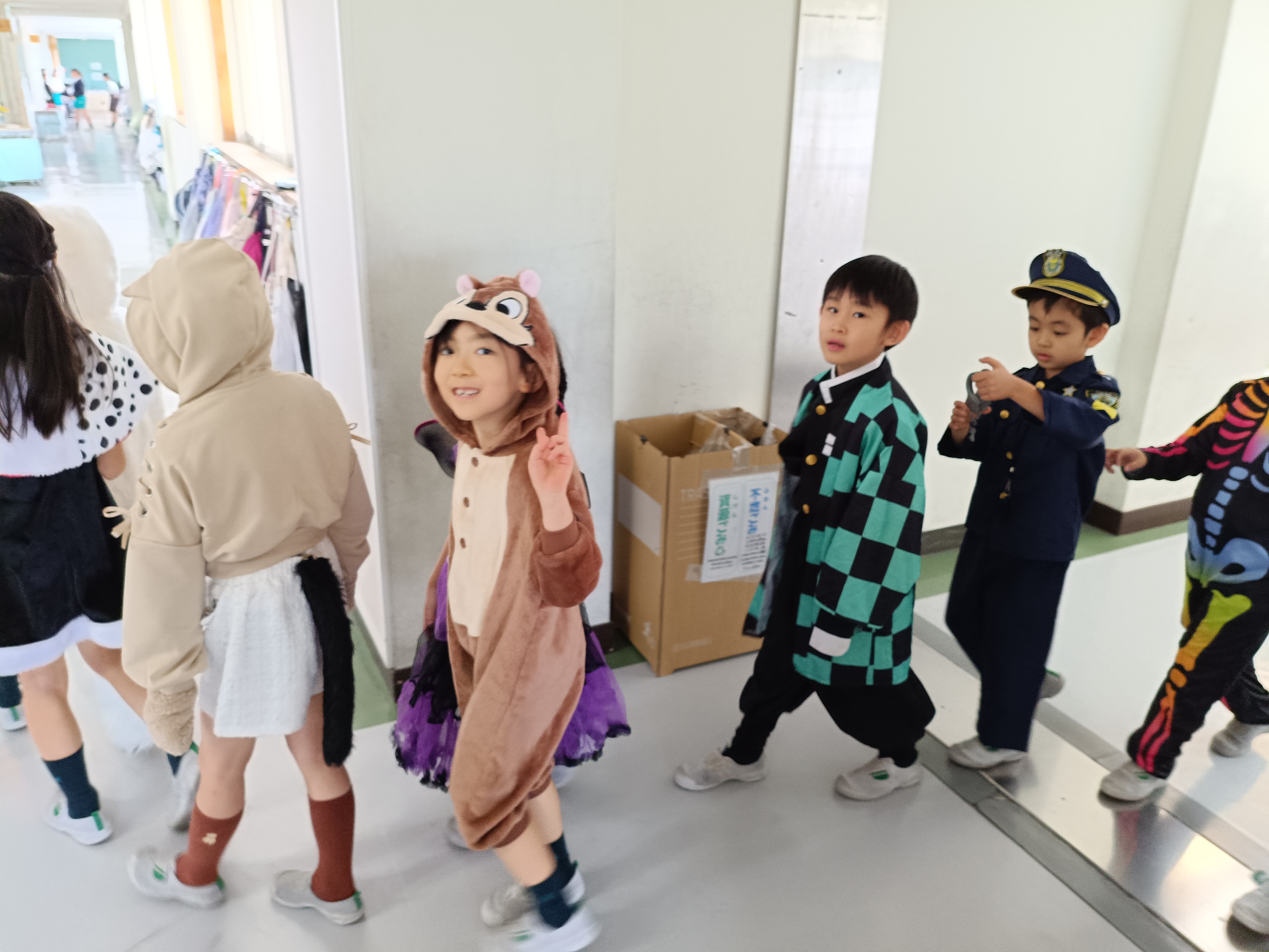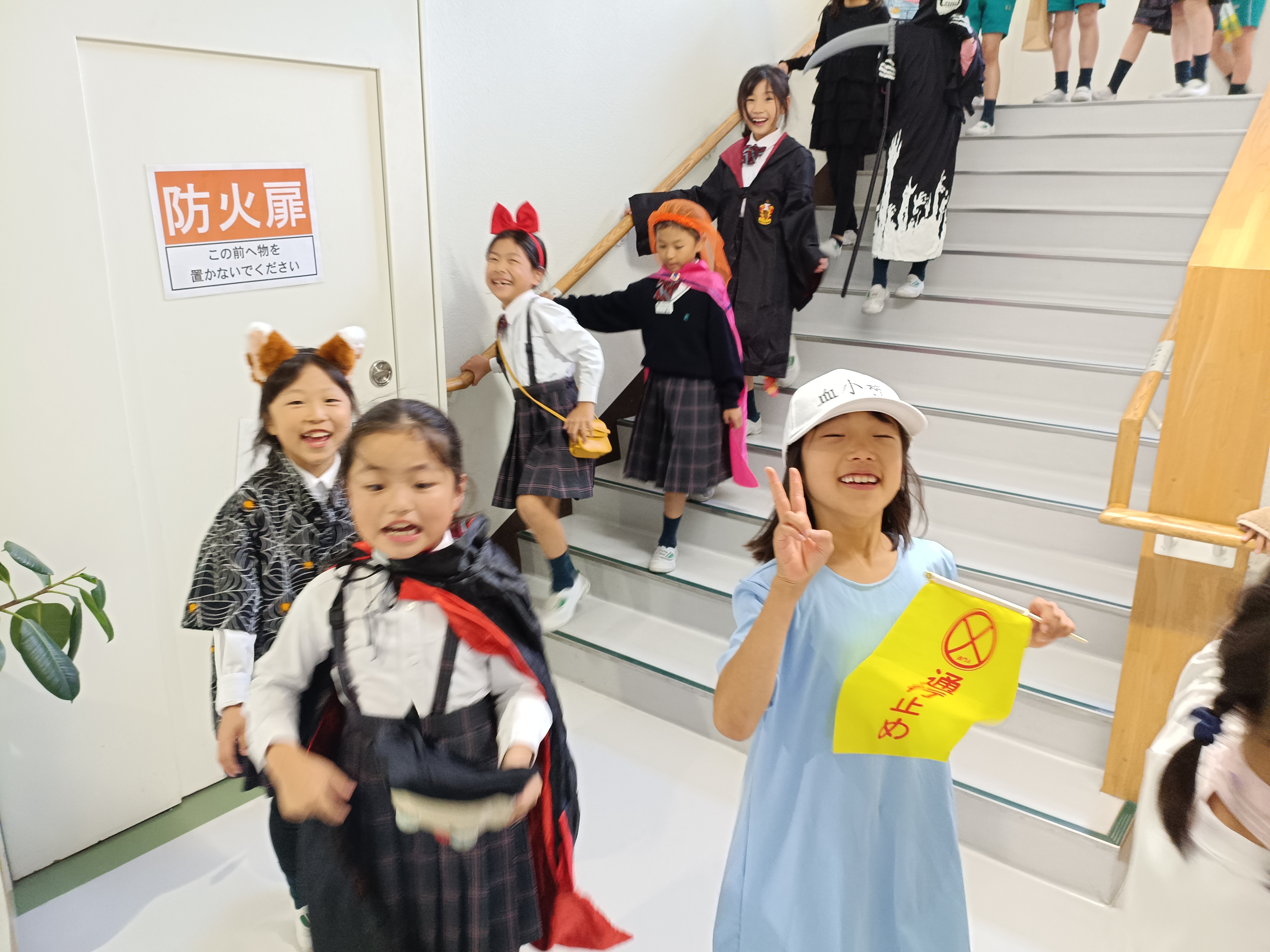 思い思いの仮装で笑顔いっぱい! 子どもたちは、ご家庭から持参した個性豊かな仮装に身を包み、校内をパレードしました。普段の制服姿とは違う子どもたちの弾けるような笑顔が校舎にあふれました。