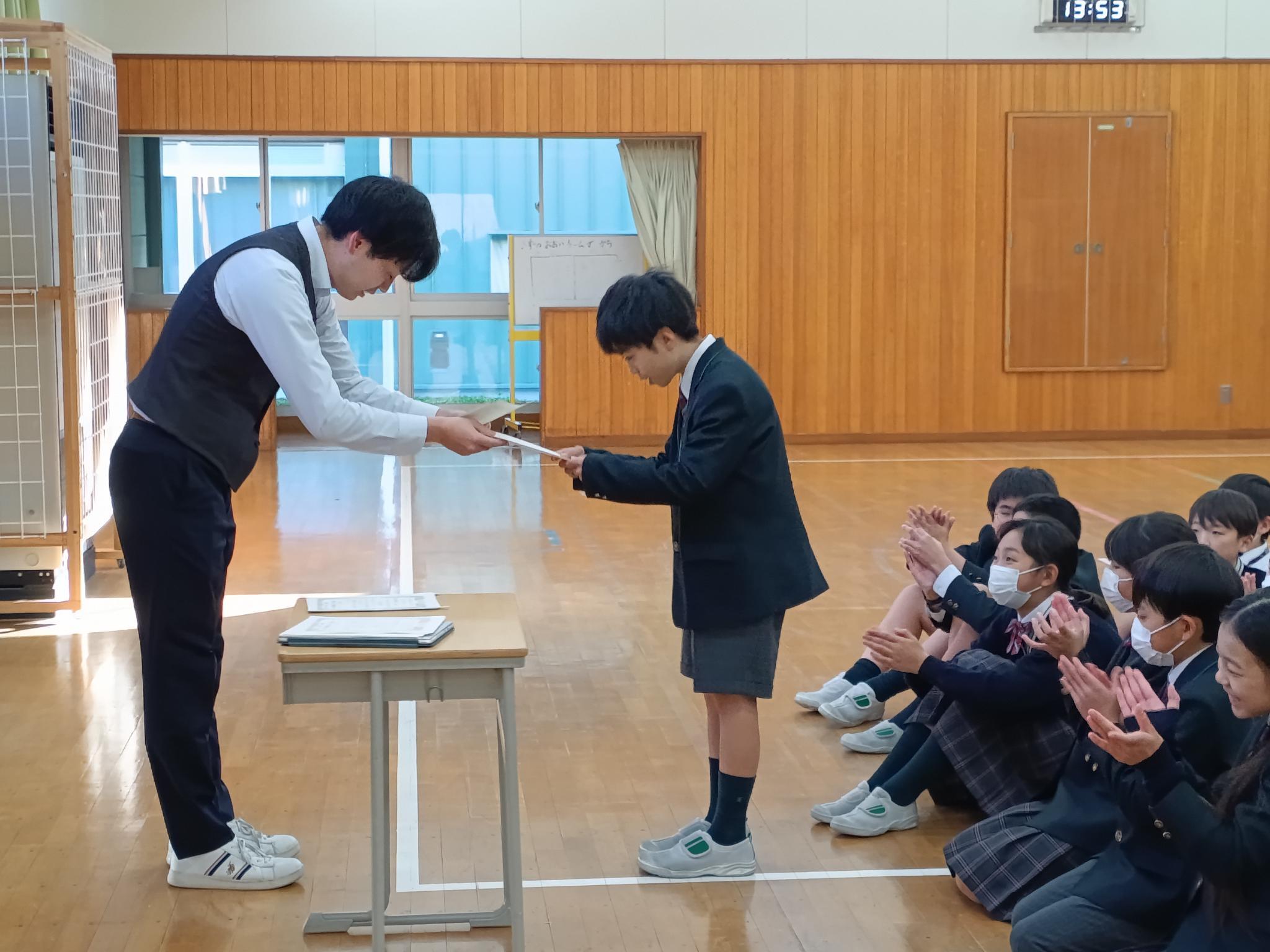 昨日行われたチャレンジランニングの表彰式を行いました。えらぶ学年の良い所の一つが、友達のがんばりに、惜しみない拍手を送れること。