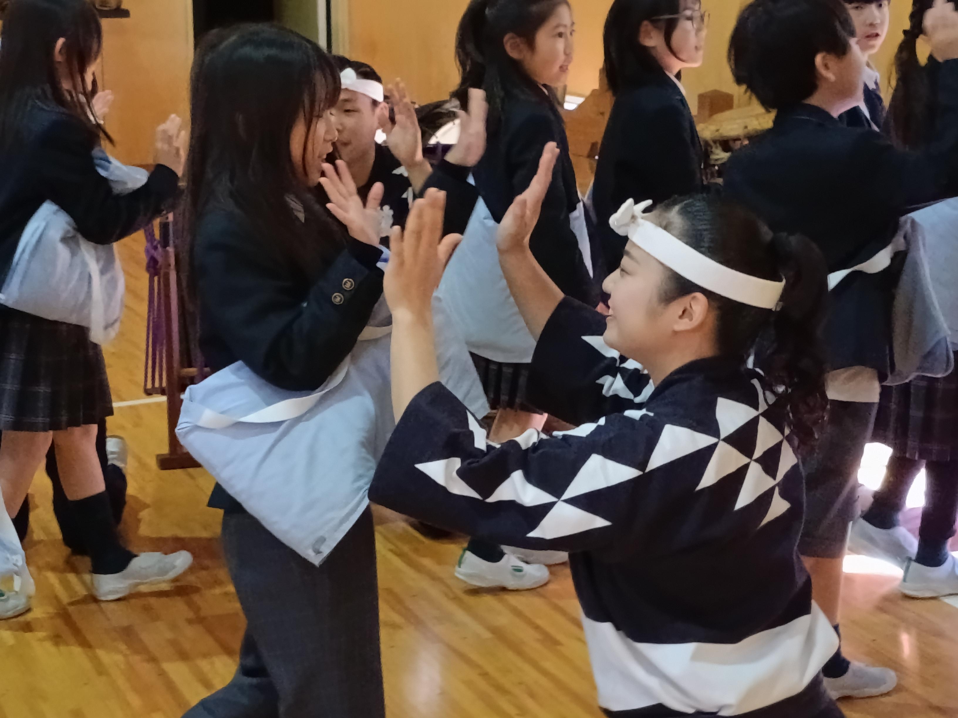 公演後には、鼓童の方とハイタッチをしてさようならをしました!教室に帰ったあとも、「演奏していたあの方のファンになっちゃった!」「すごかった!」「かっこよかった!」と話す子もいて、鼓童の魅力にすっかりとりこになった様子でした。