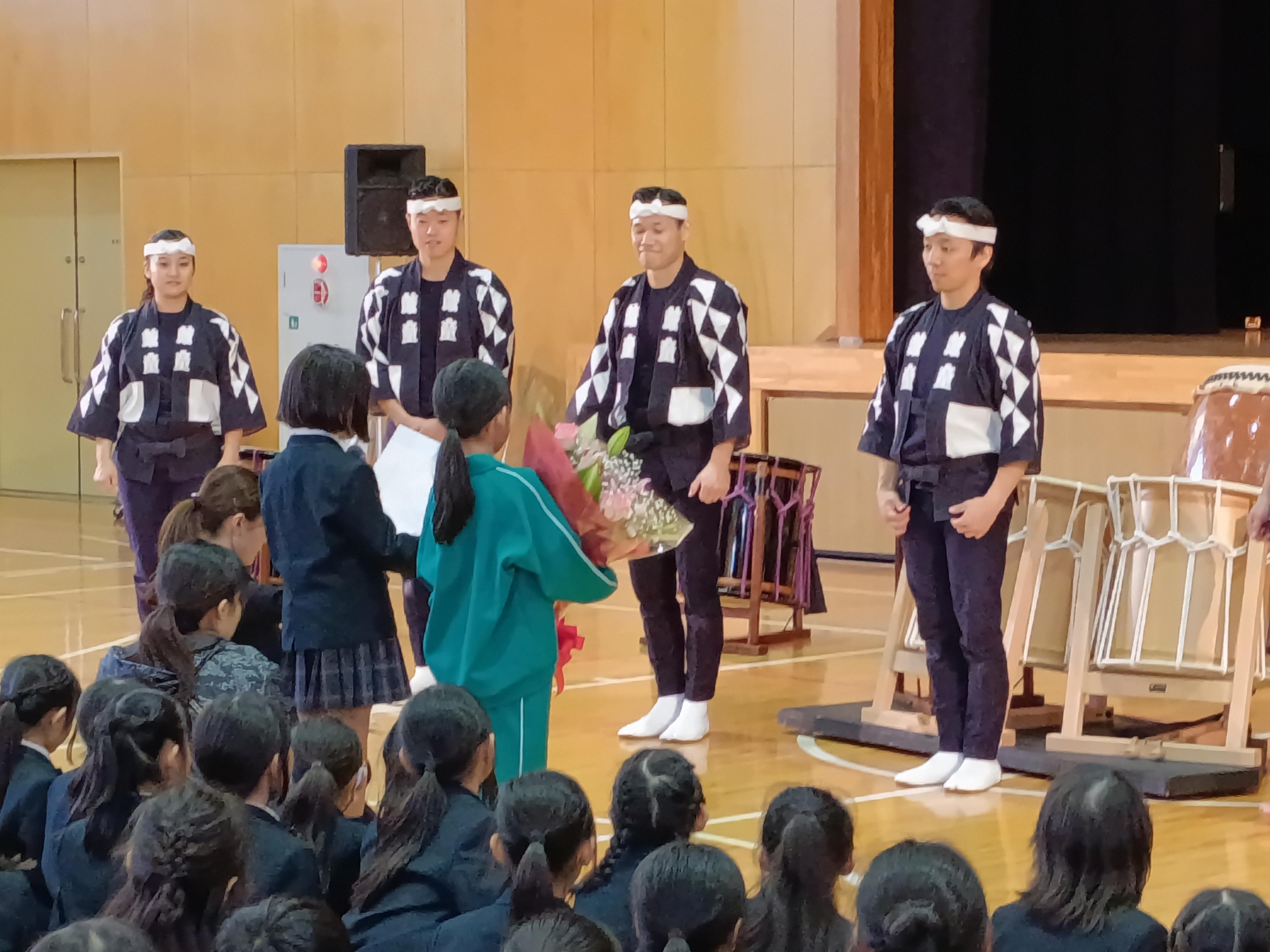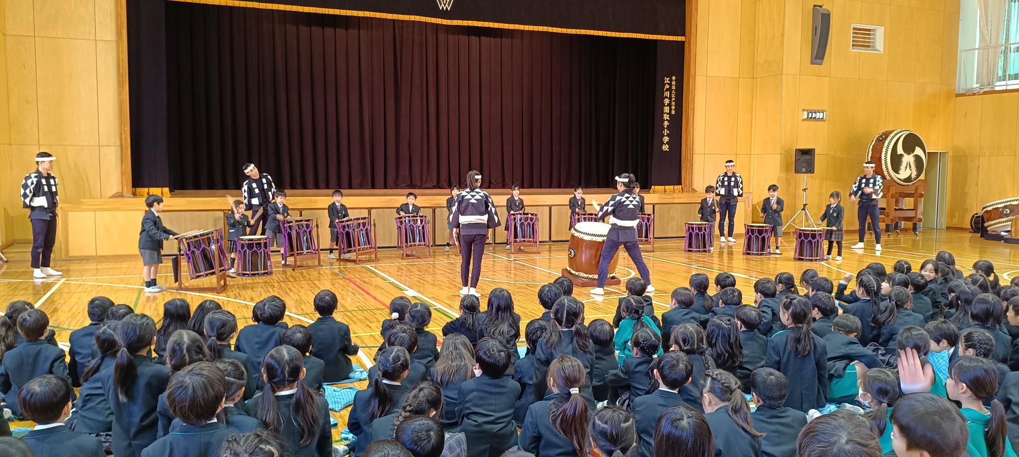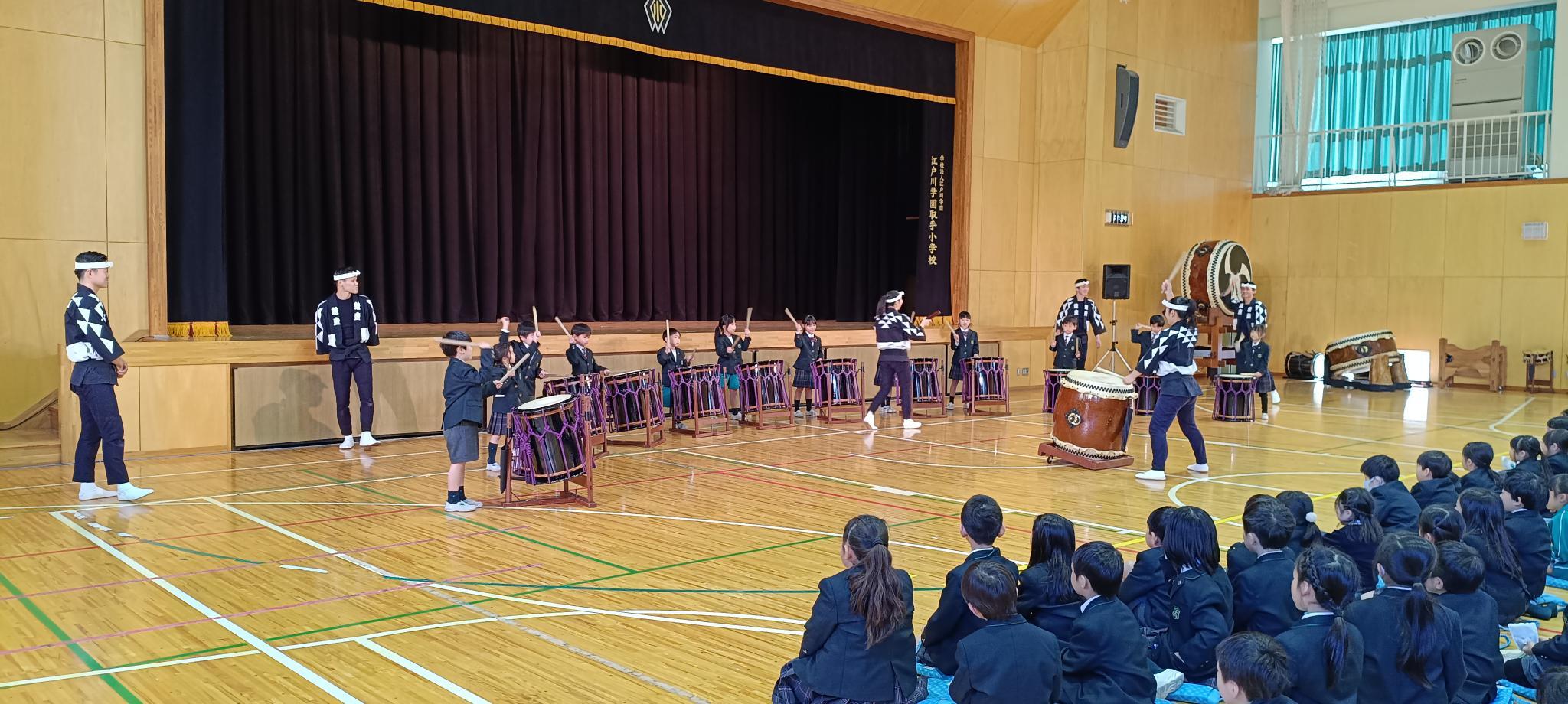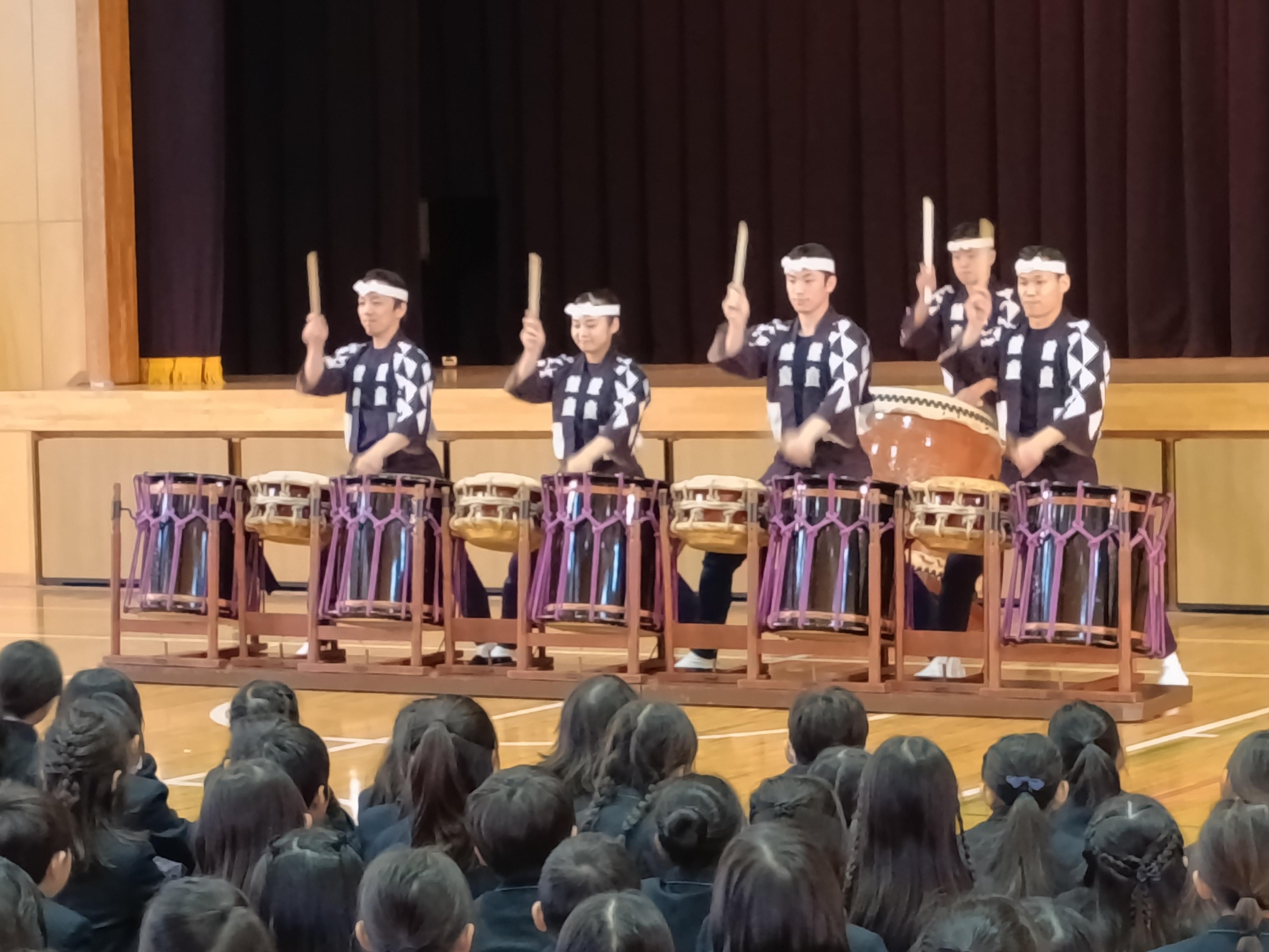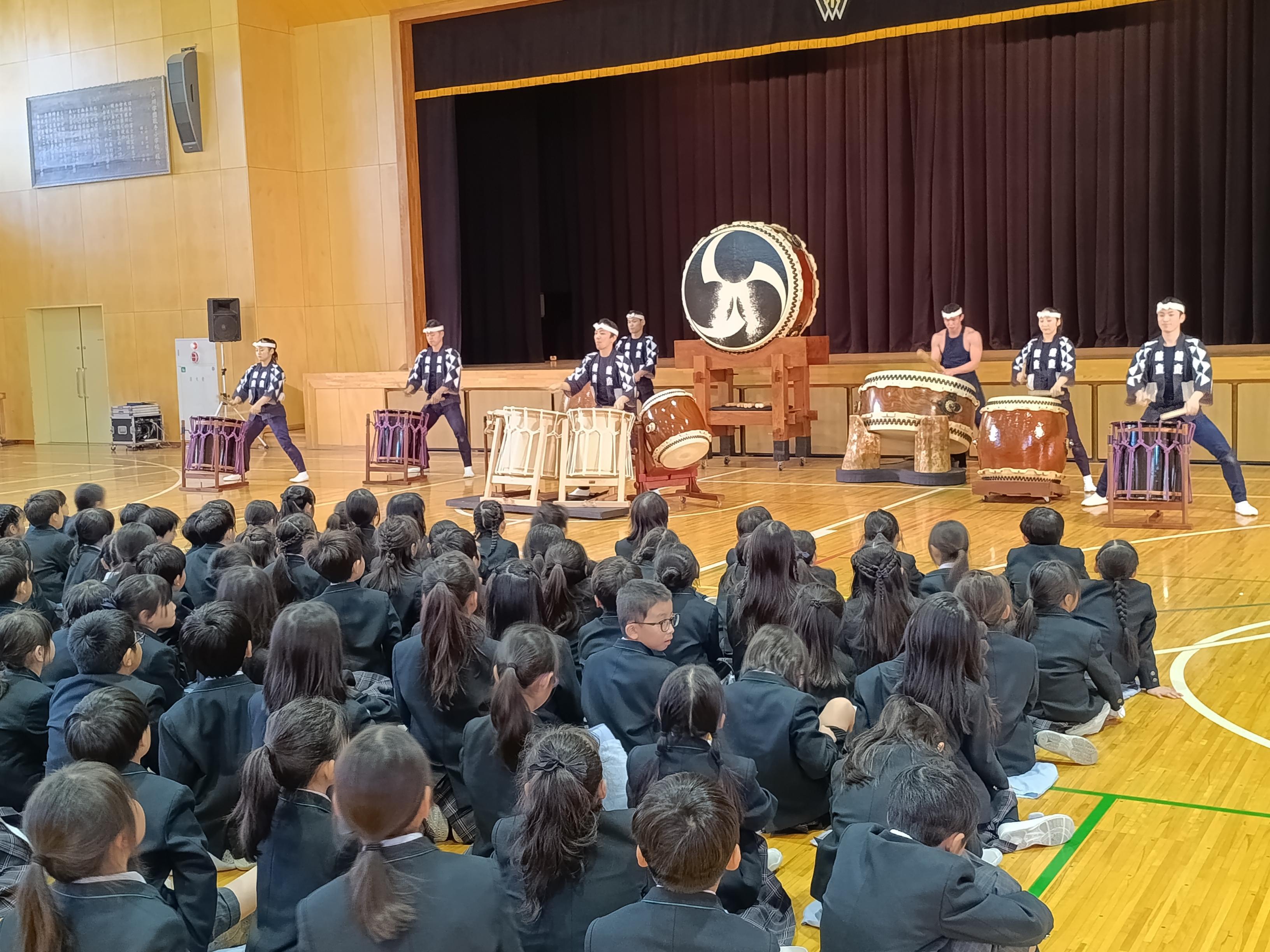 先日、1・2年生が芸術鑑賞会を行い、学校の体育館に太鼓芸能集団「鼓童」の皆さんをお迎えしました。
