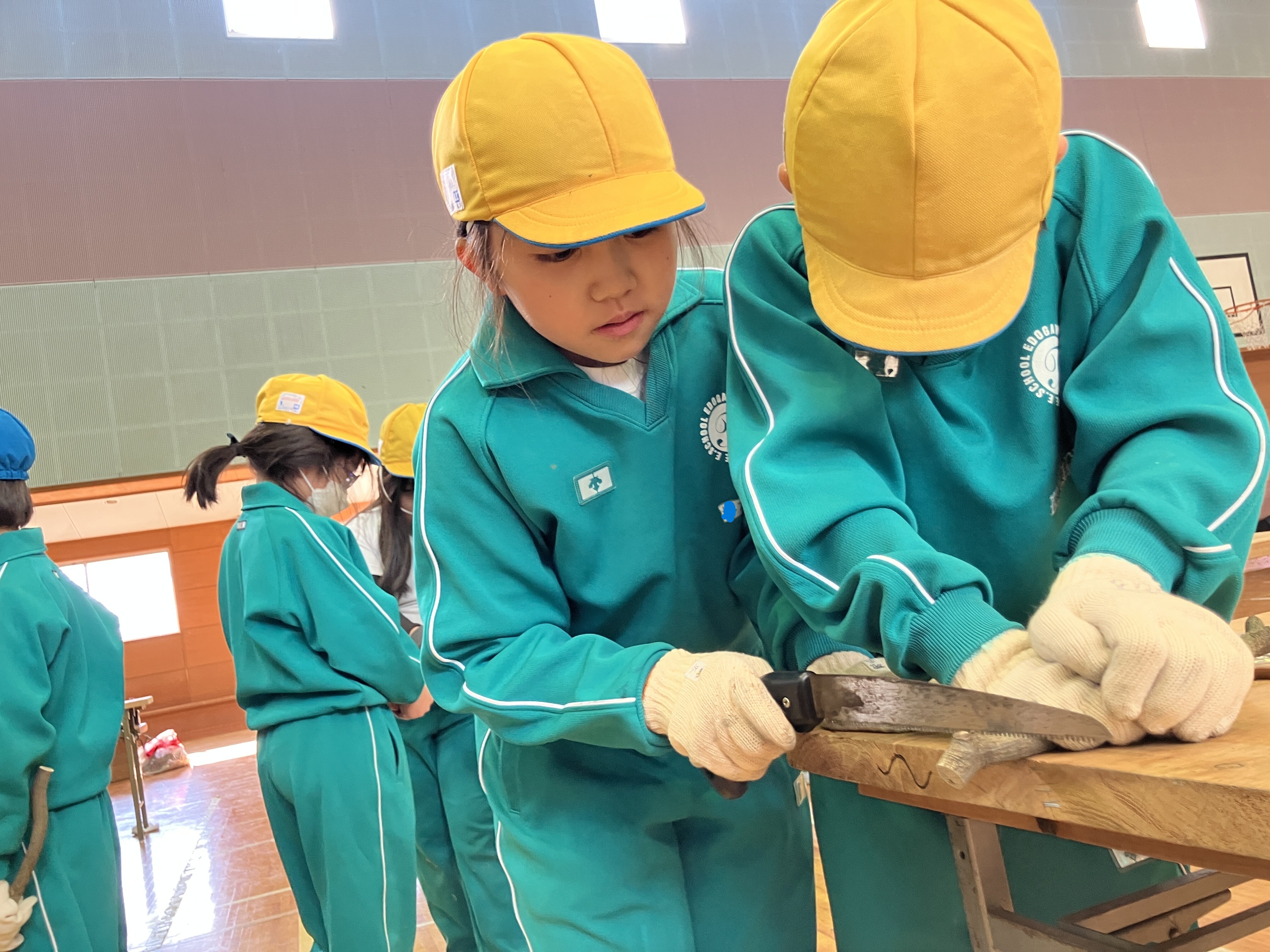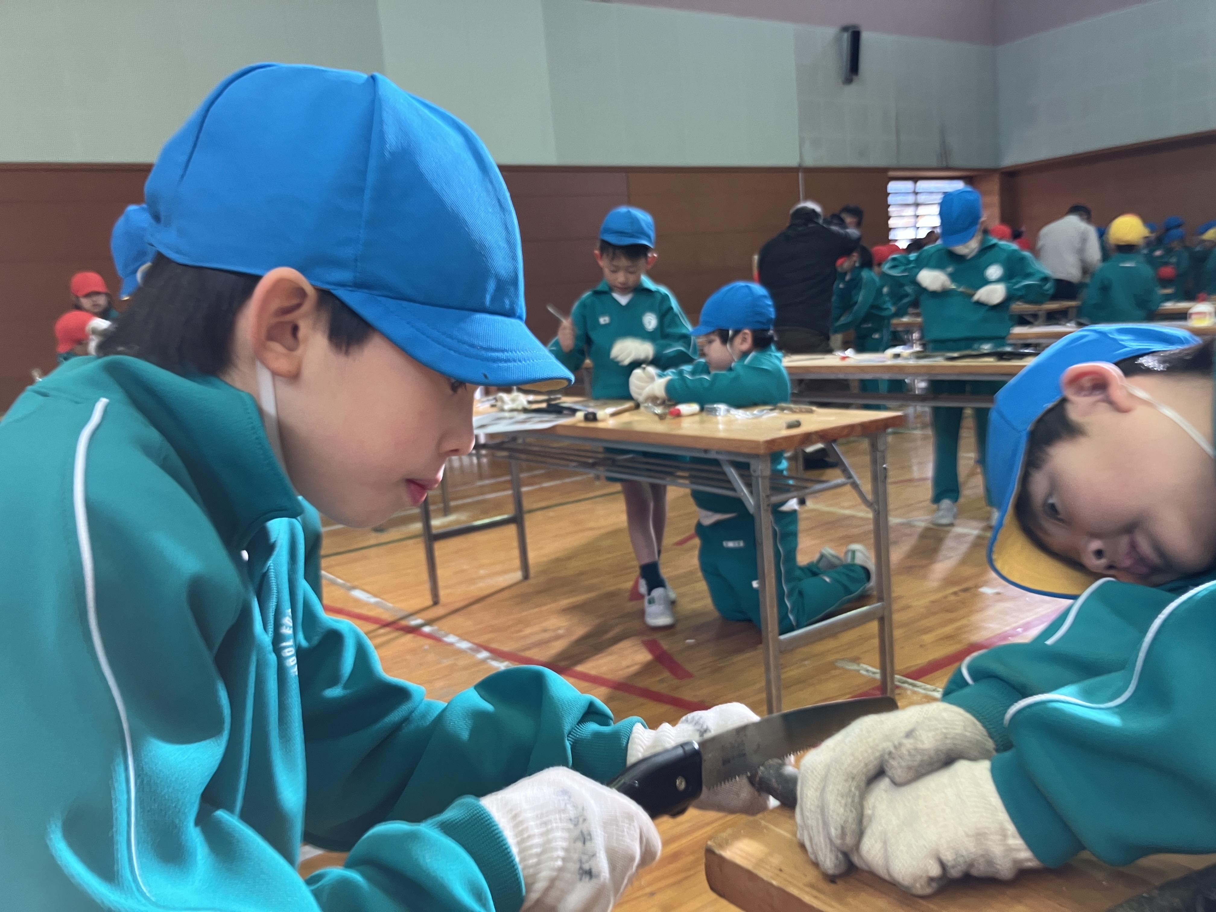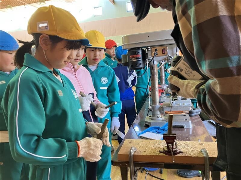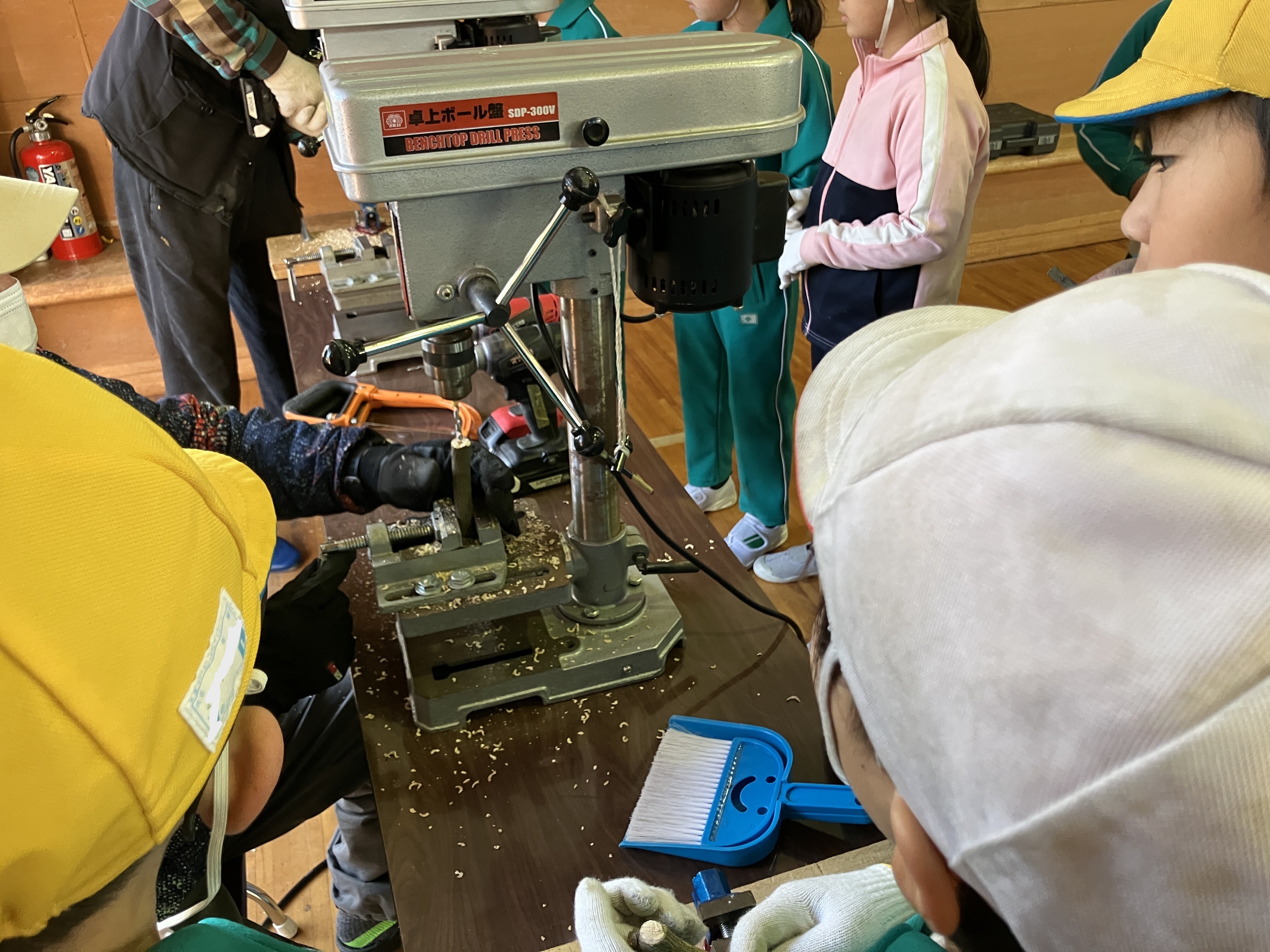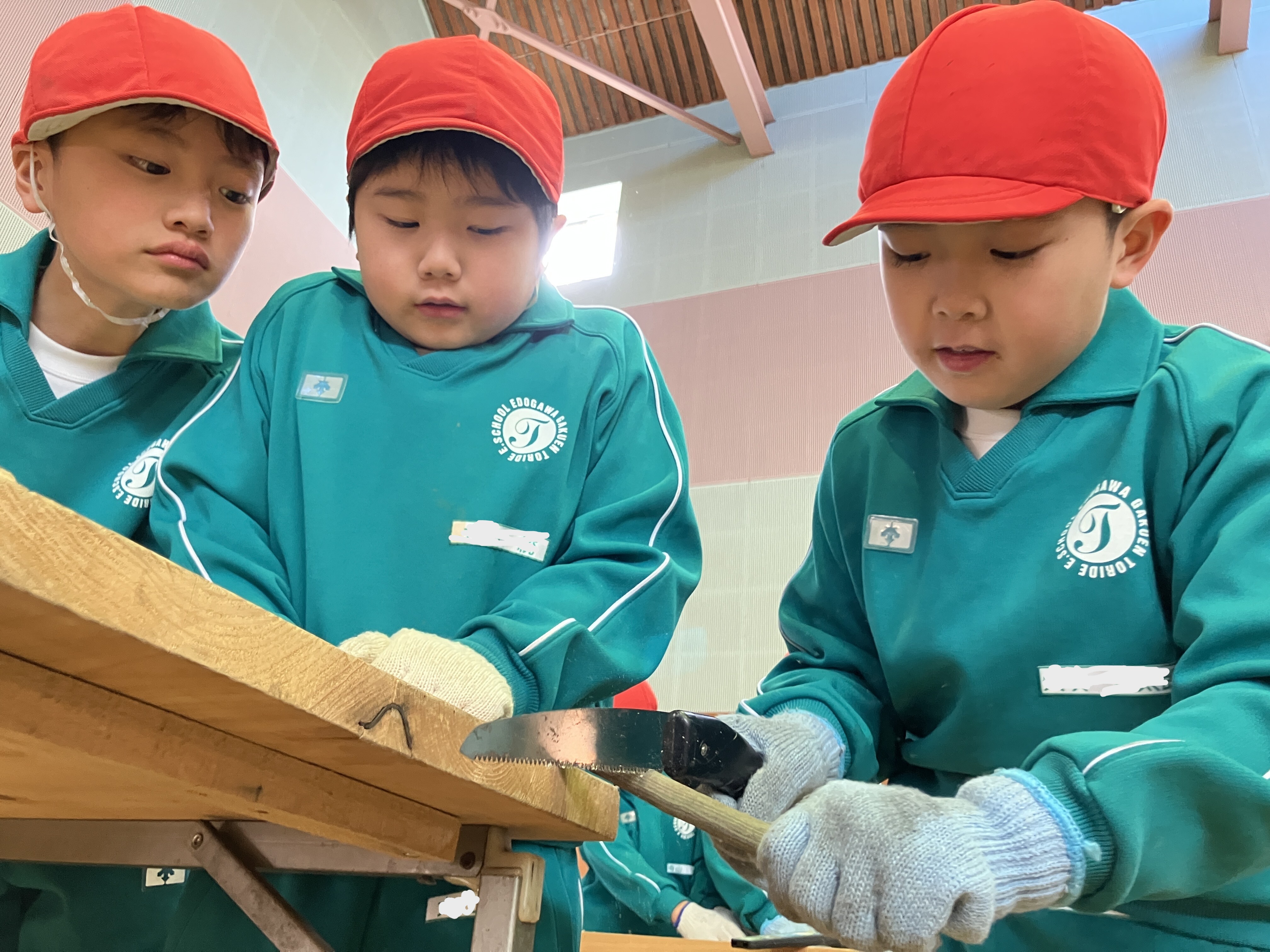 ノコギリやトンカチを協力して使ったり、穴をあけてもらうドリルの機械を興味深そうに見たりしながら、