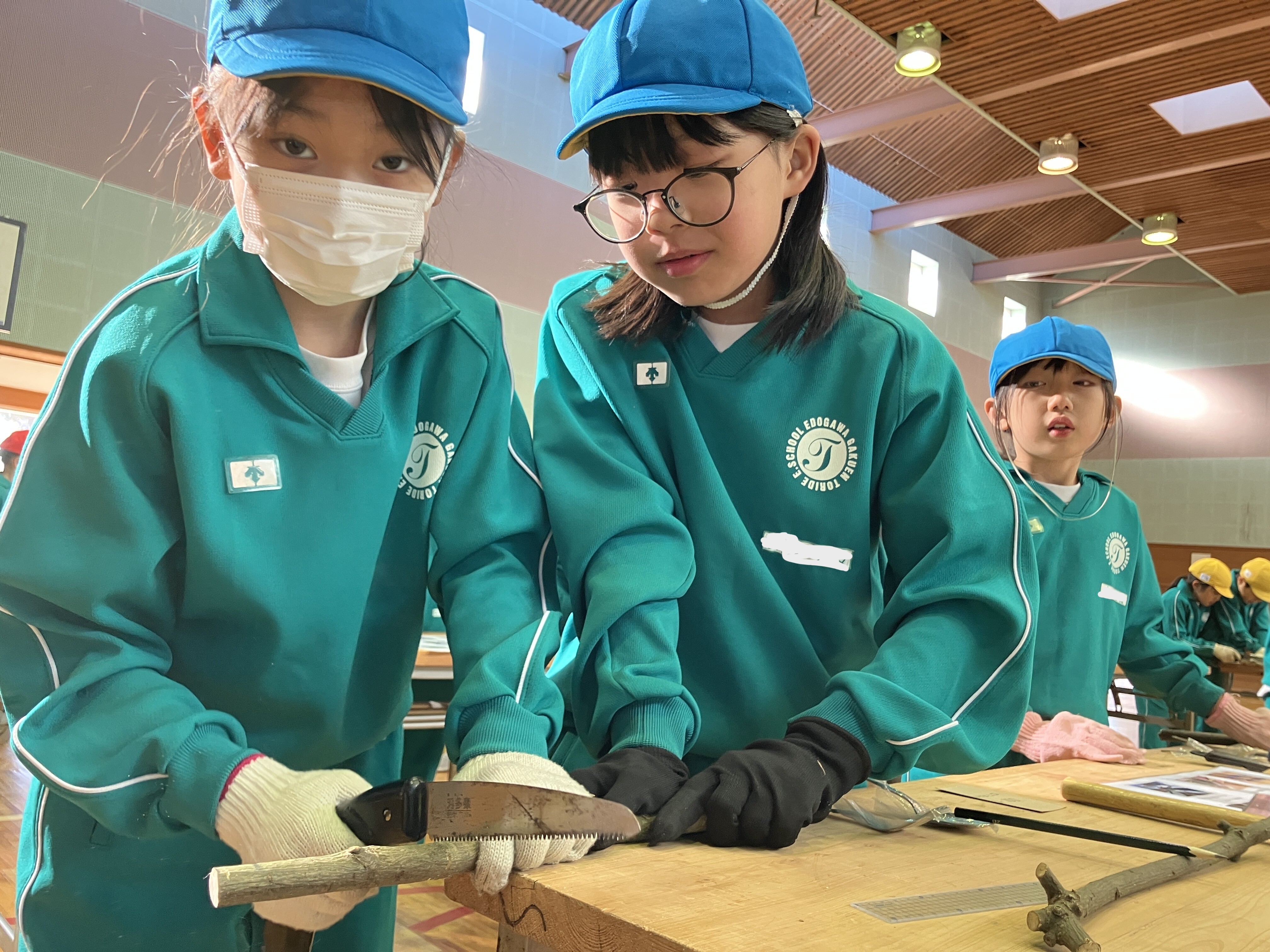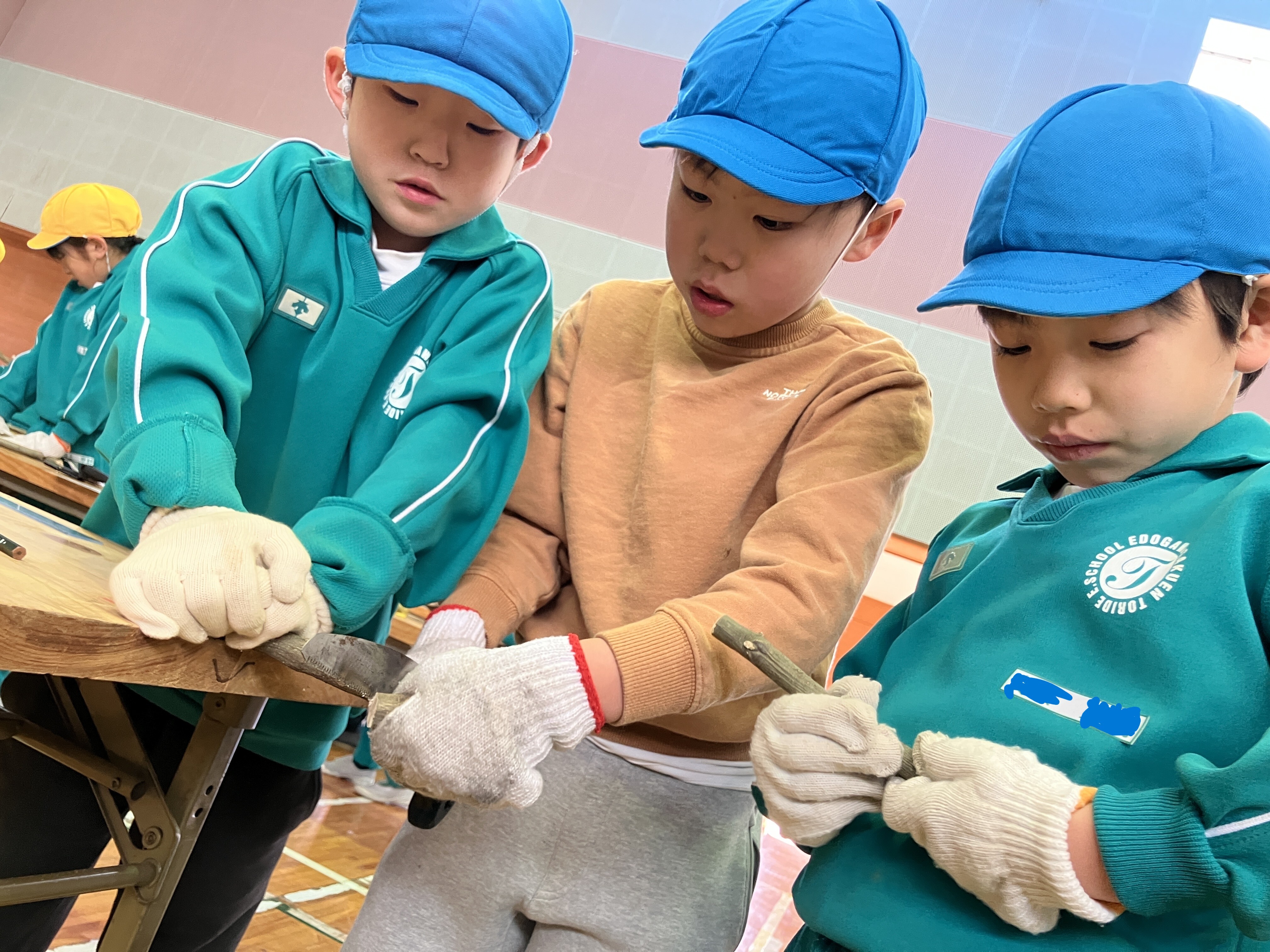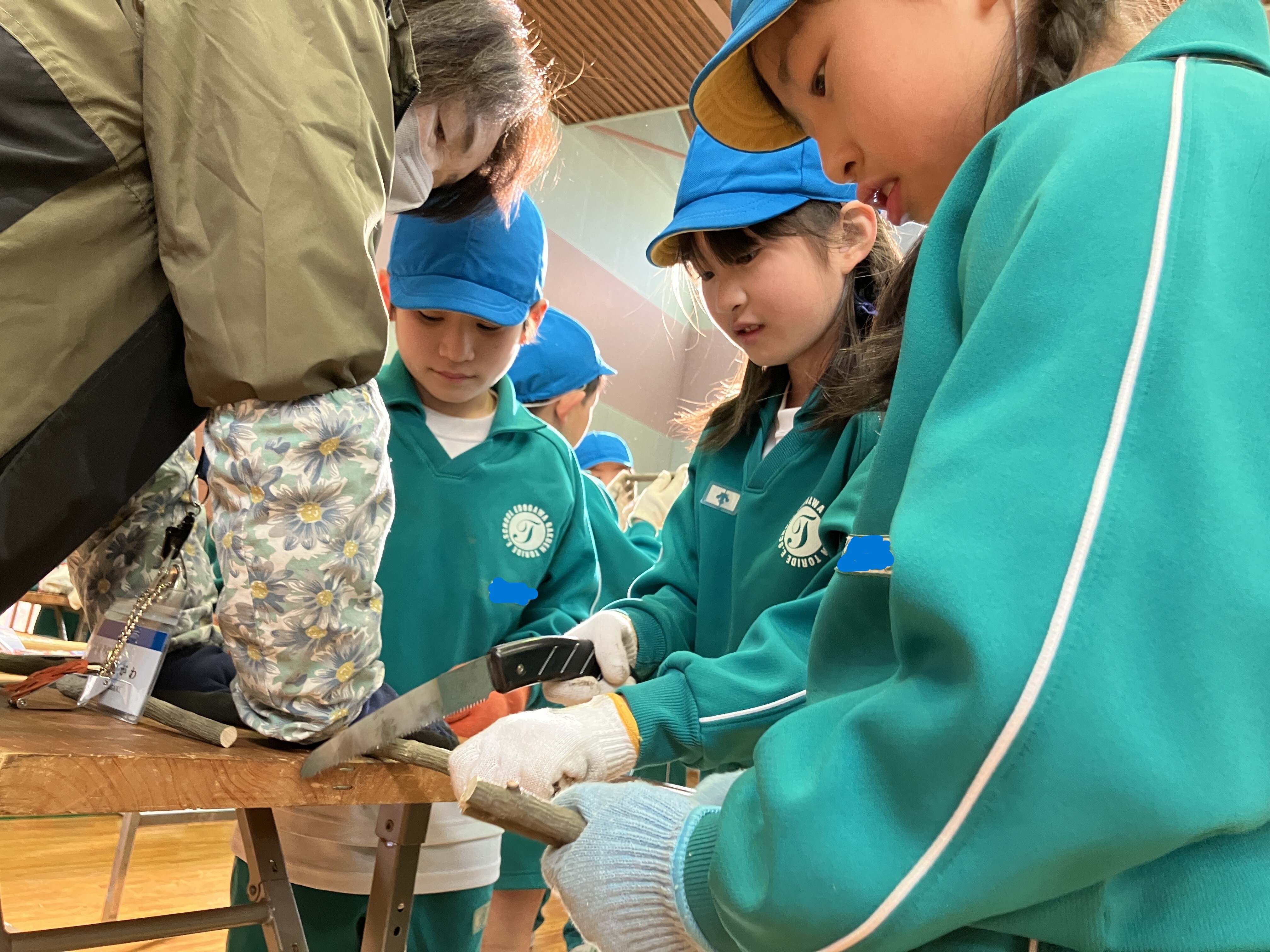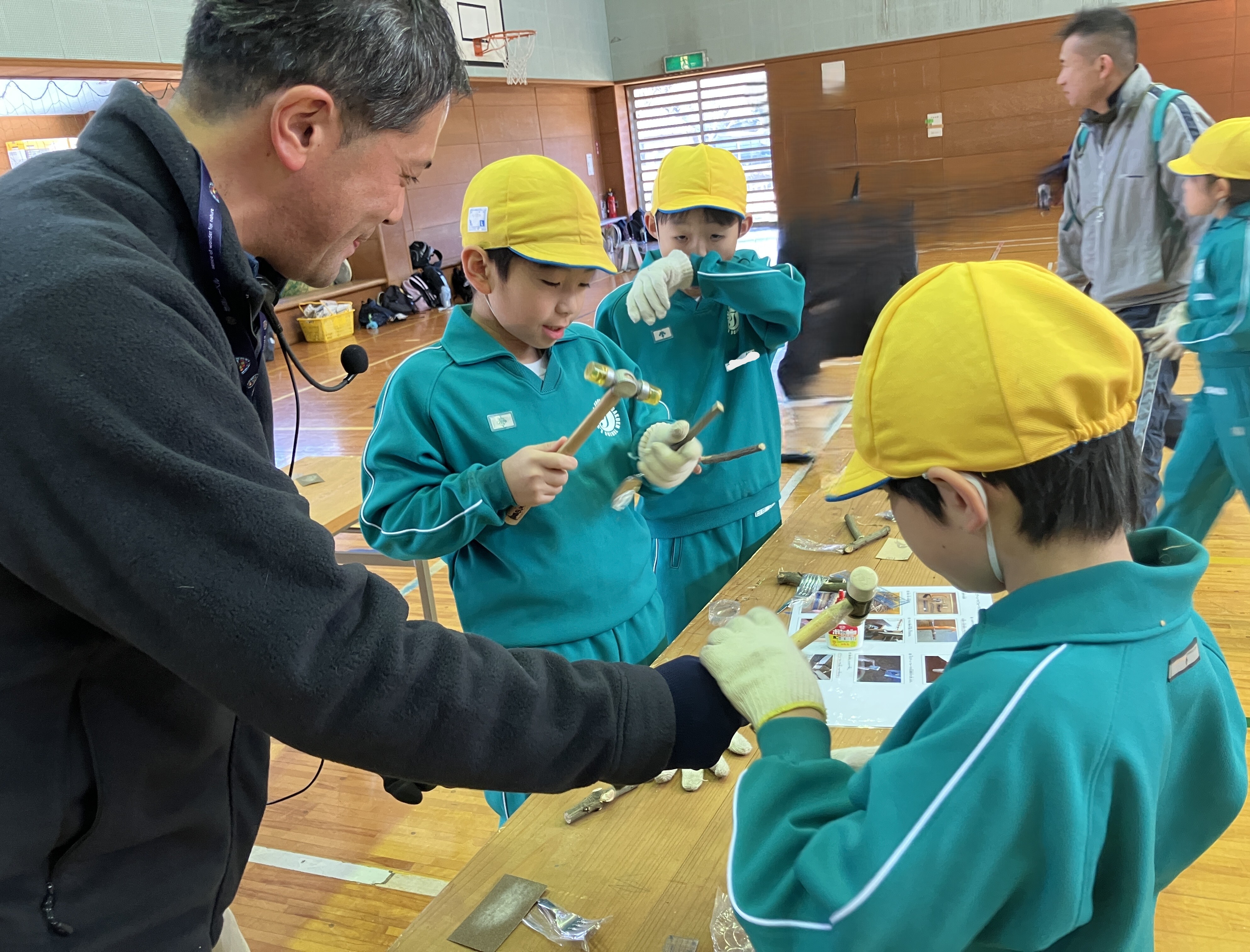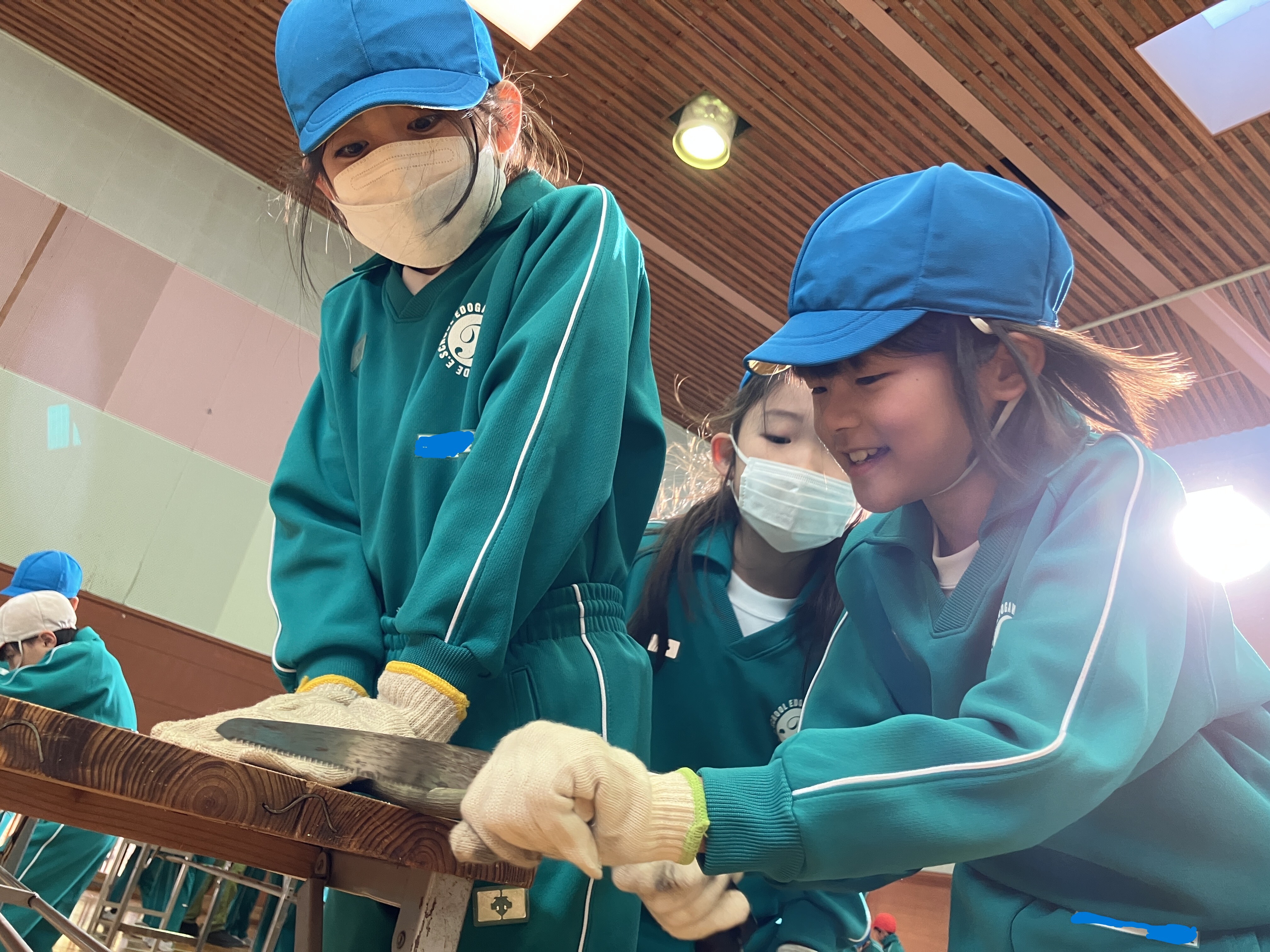 ノコギリやトンカチを協力して使ったり、穴をあけてもらうドリルの機械を興味深そうに見たりしながら、
