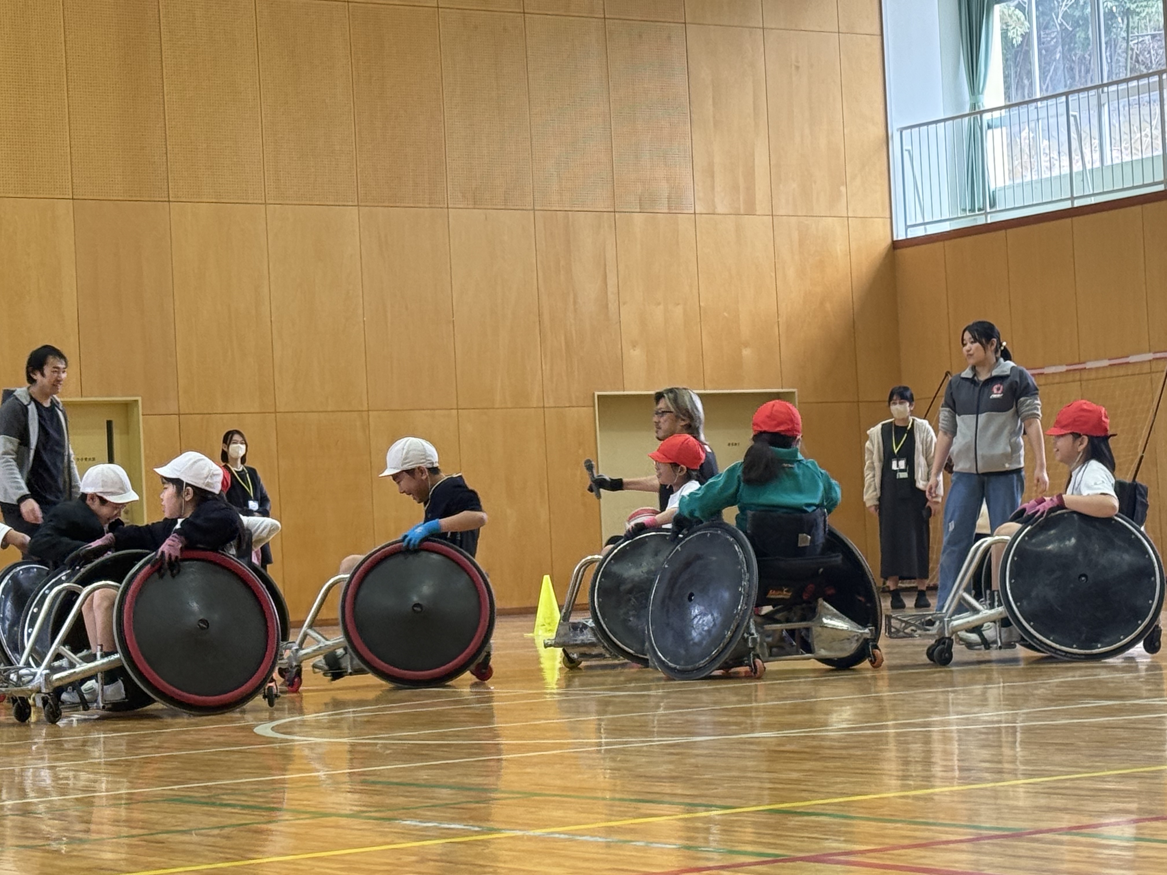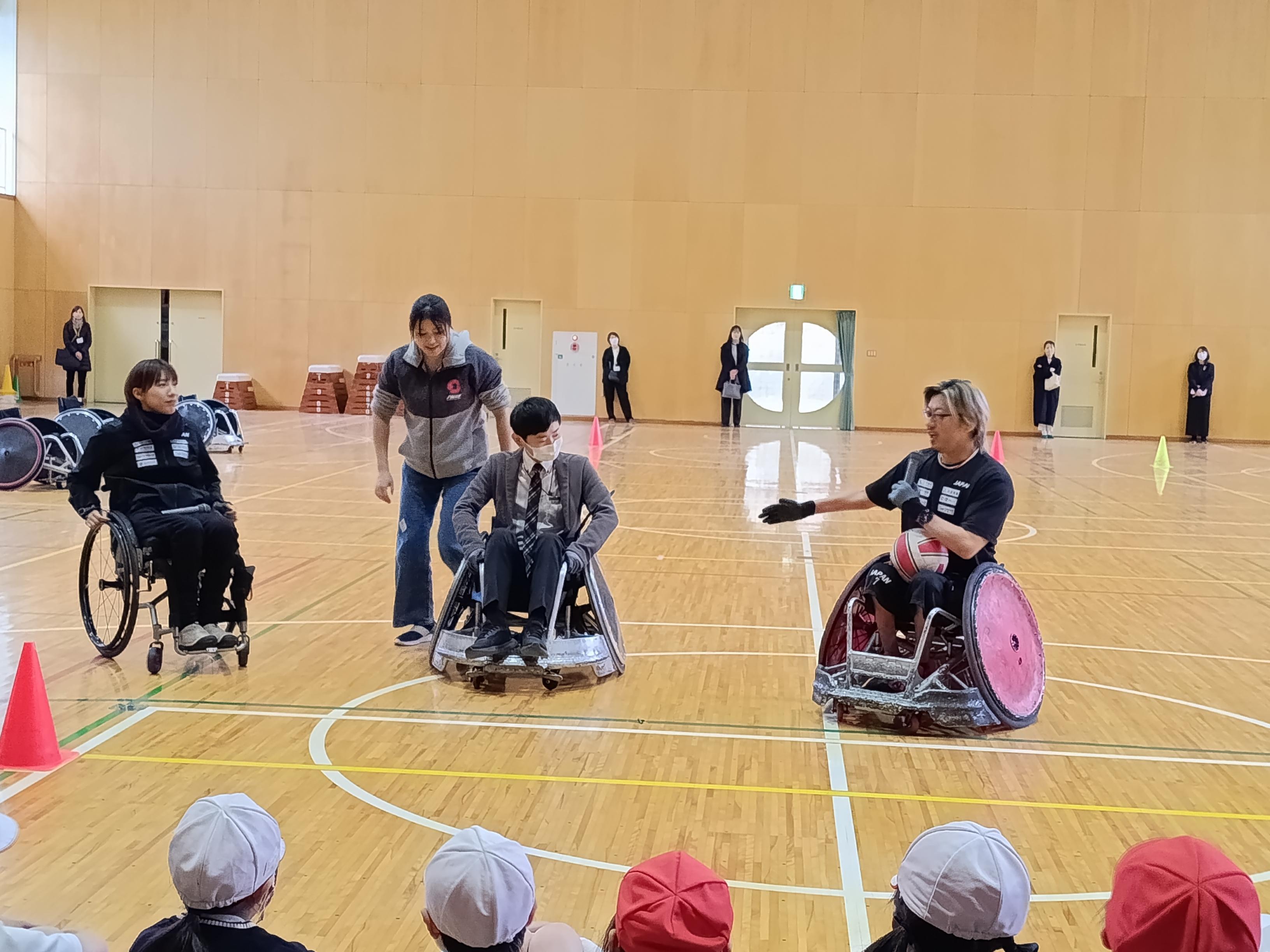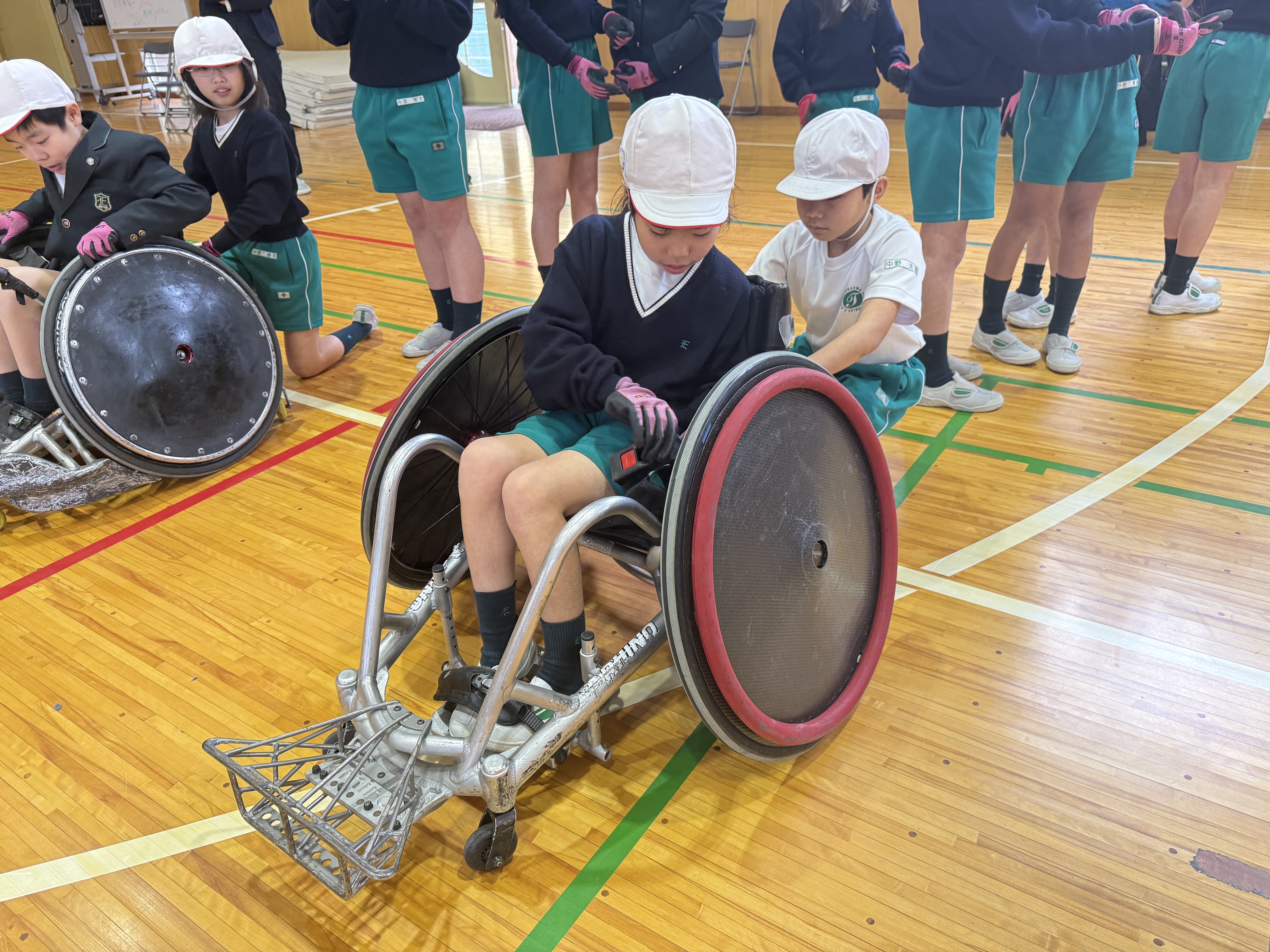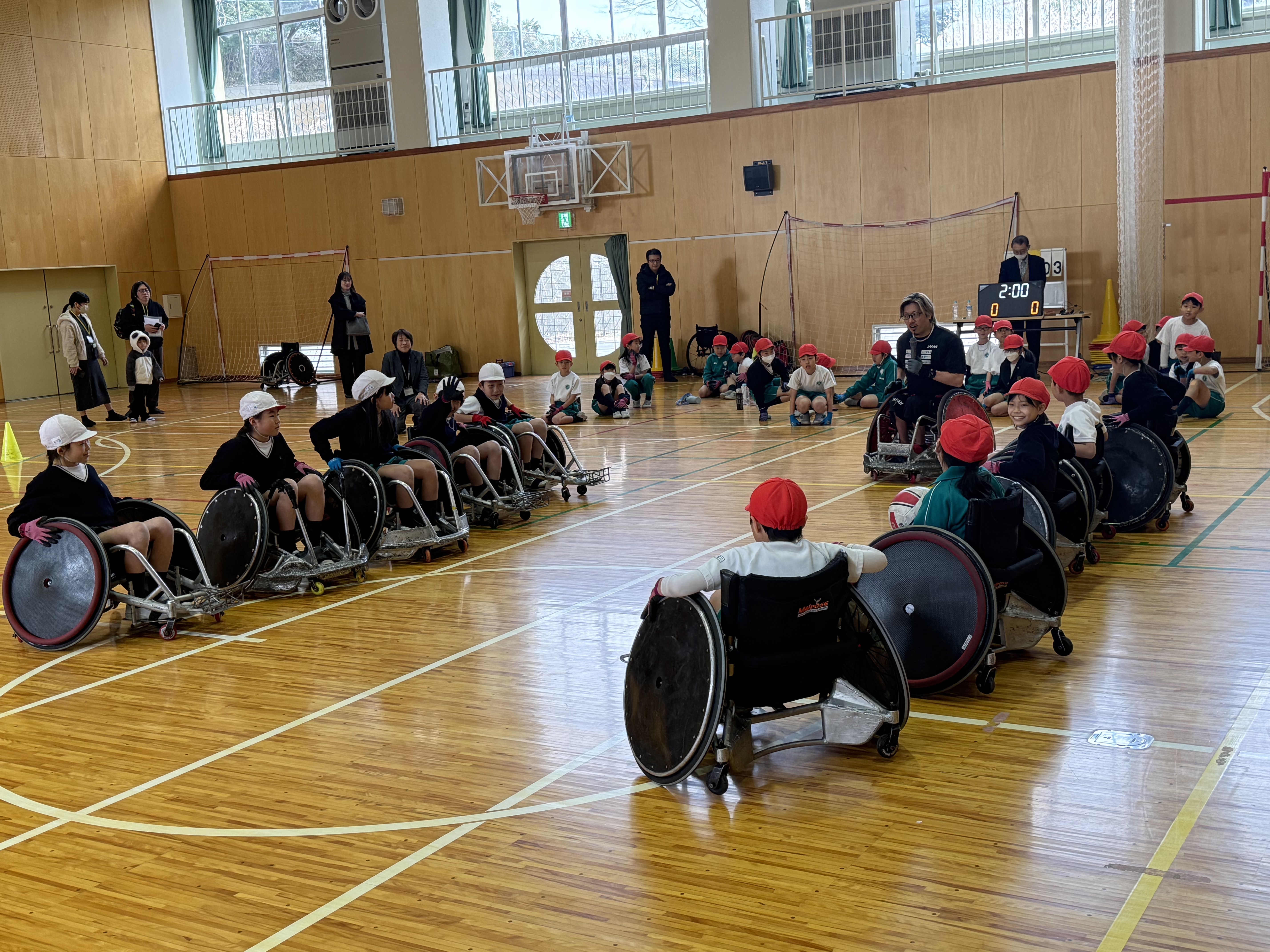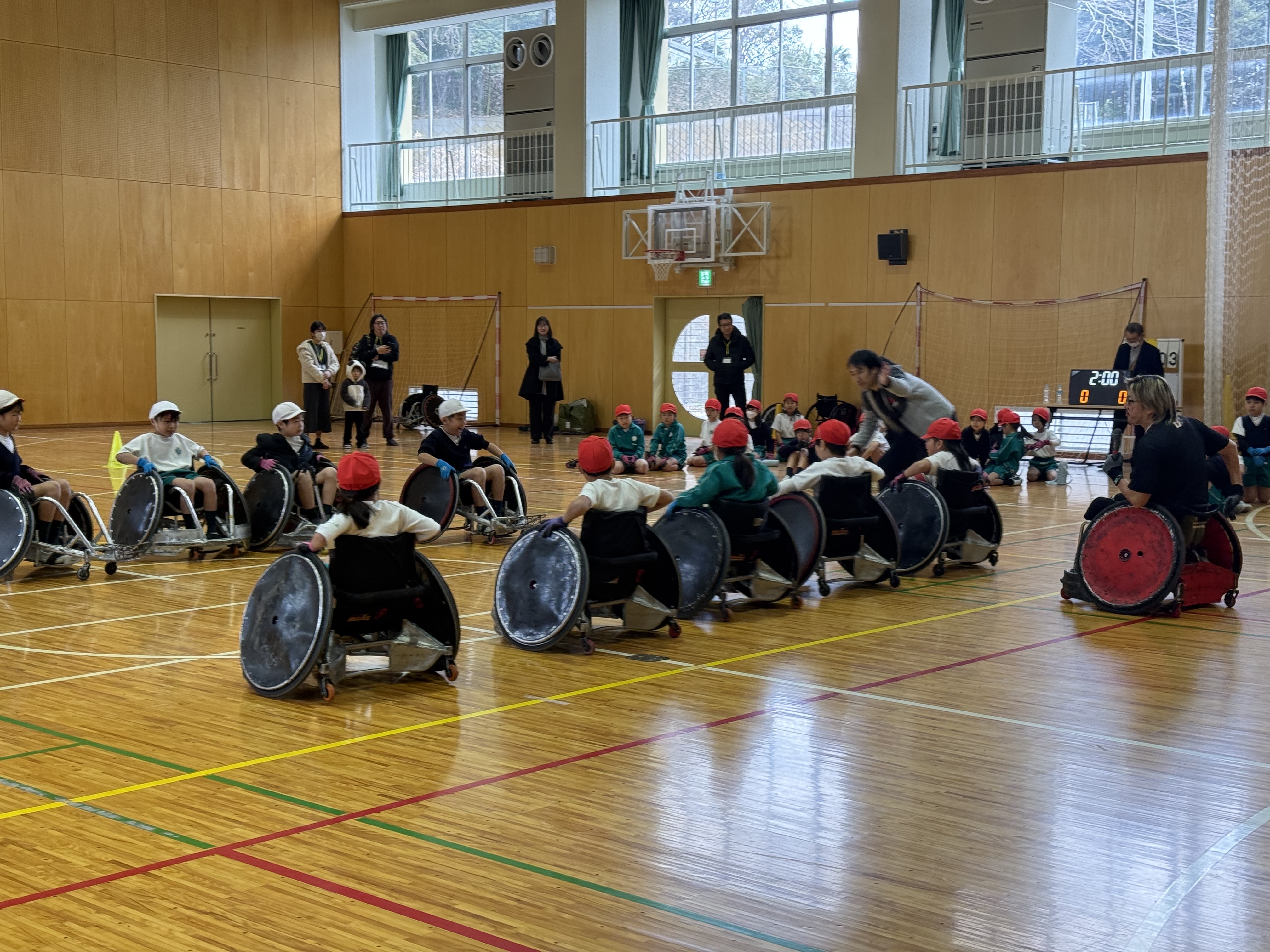 「ガツン!」体育館に響く驚きの衝撃音。交流会では、全児童が実際に競技用車いすに乗ってタックルを受ける体験をしました。「ガツン!!」車いすと車いすがぶつかる激しい音が響くたび、見守る子供たちからは「わあ!」「すごい!」と大きな歓声が上がりました。