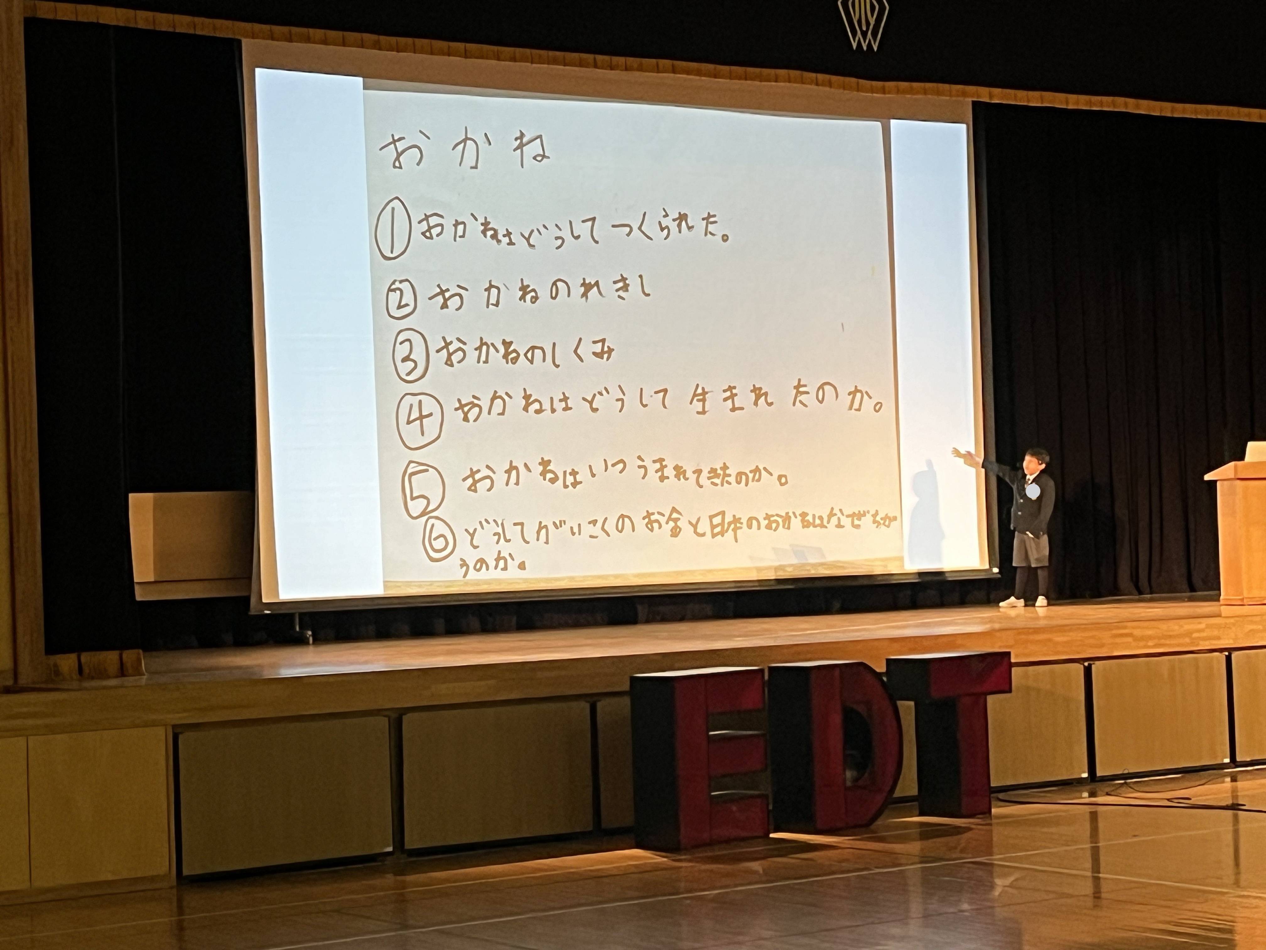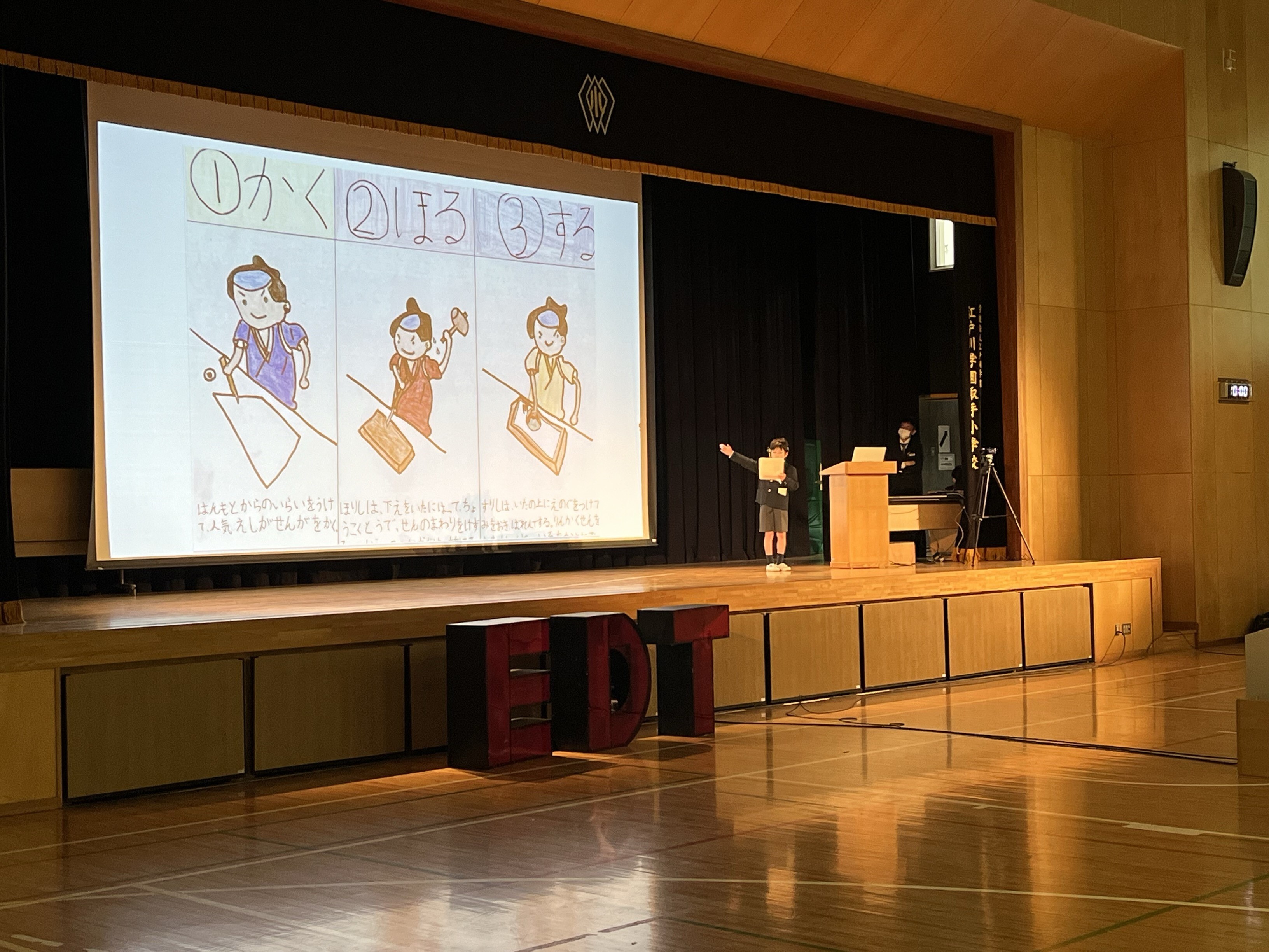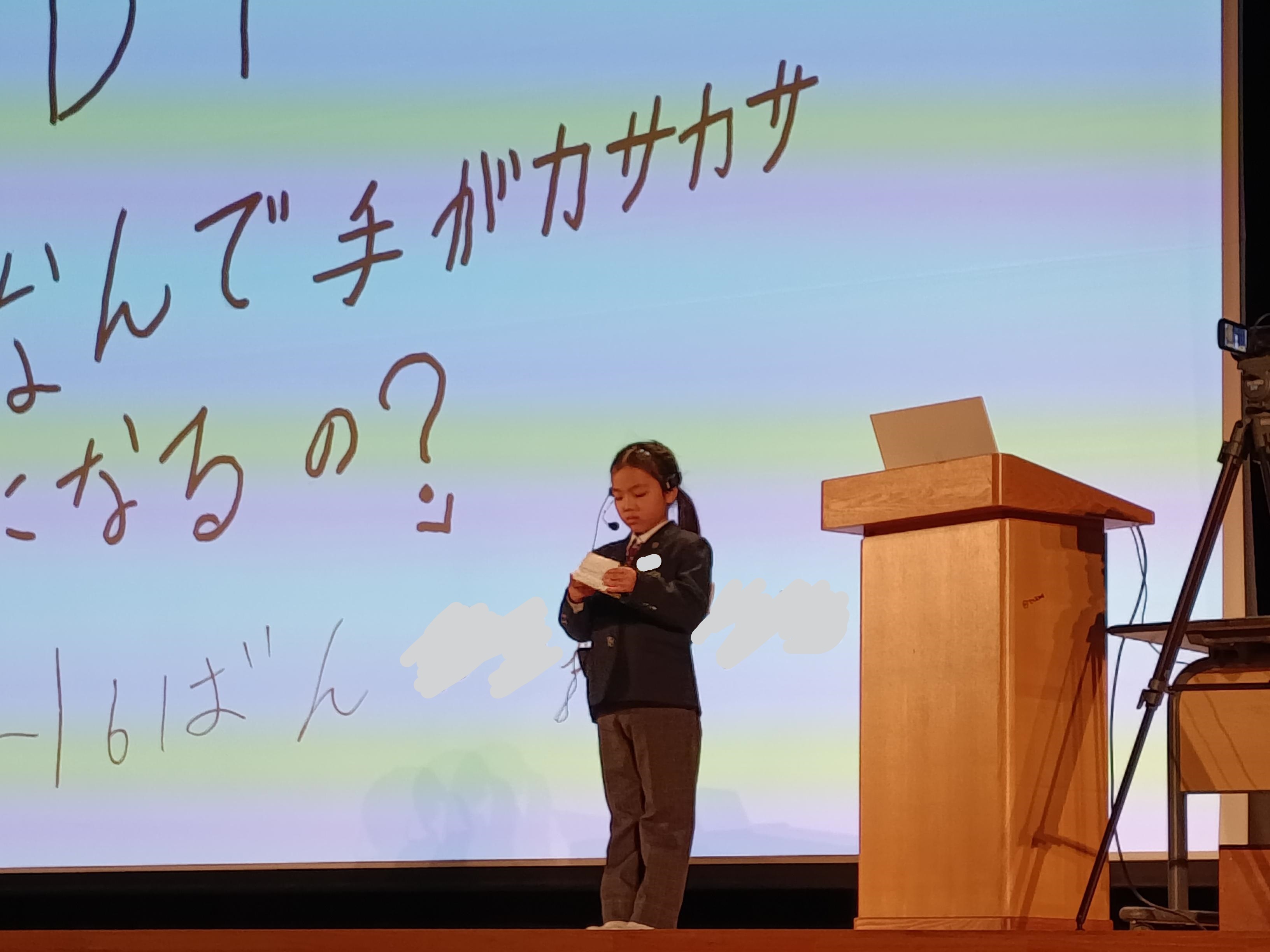 毎年恒例の校内行事EDT(例年3~6年生が発表者)に、初めて1年生3名の勇敢な戦士たちが発表者として参戦しました!555人の全校児童の前で、自分の夢や好きな事、最近気になっていることを、自分で画用紙にまとめた資料とともに、約5分間プレゼンしました。3人の勇敢な姿に奮い立たされ、来年への展望を抱いた子もたくさんいました。3人とも、本当にお疲れ様でした!!