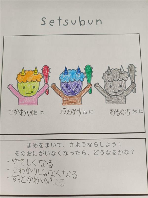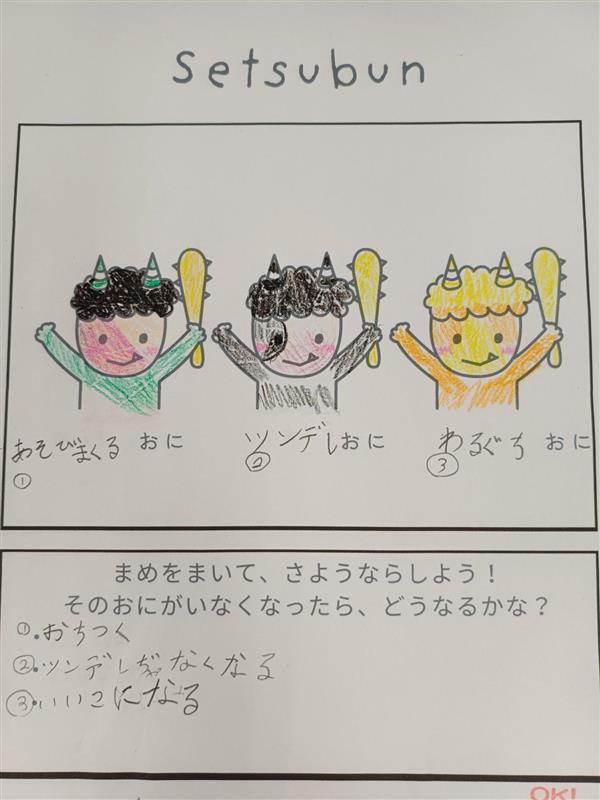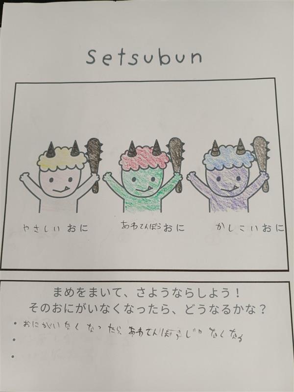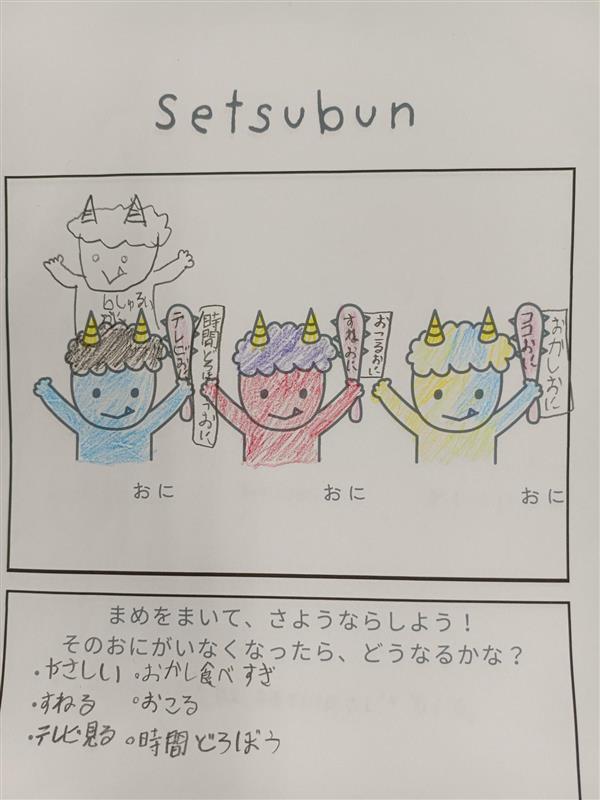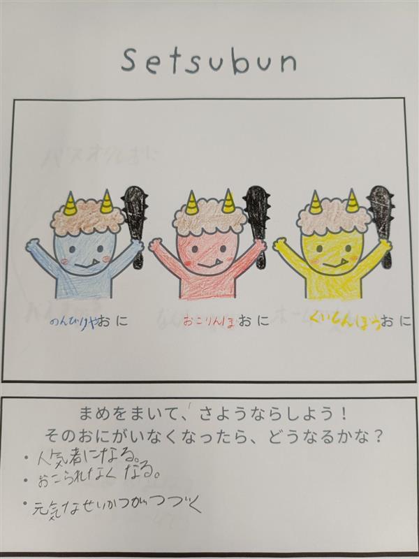 お話の後は、自分の中のおにについて考えます。追い出したいおにはいるかな?それはどんなおにかな?