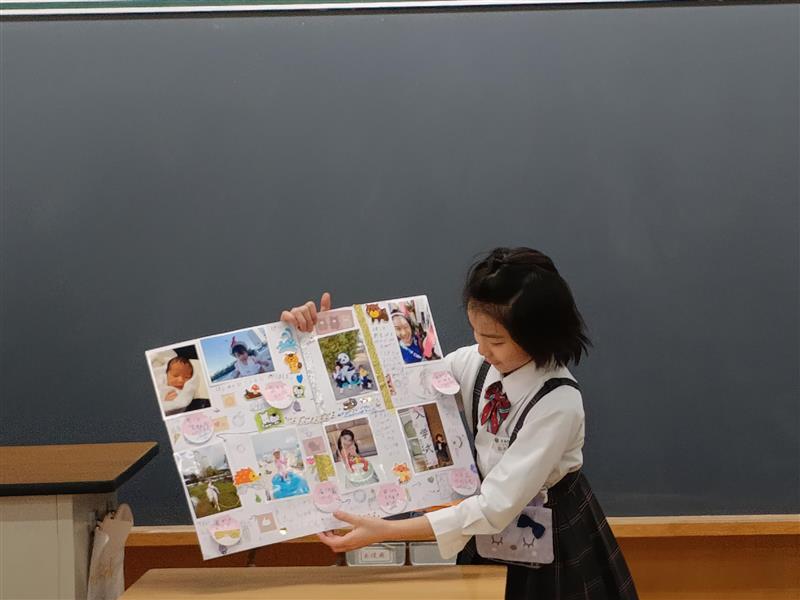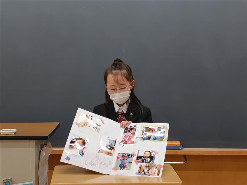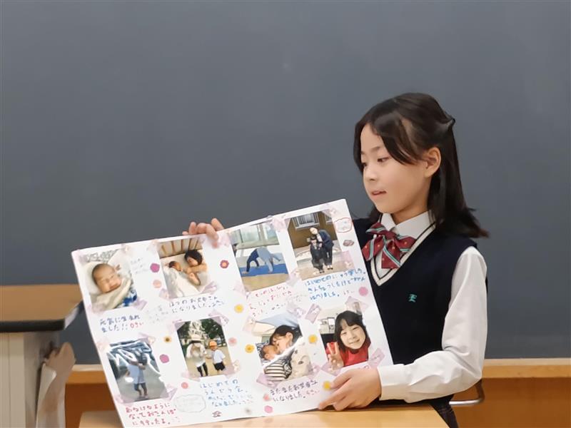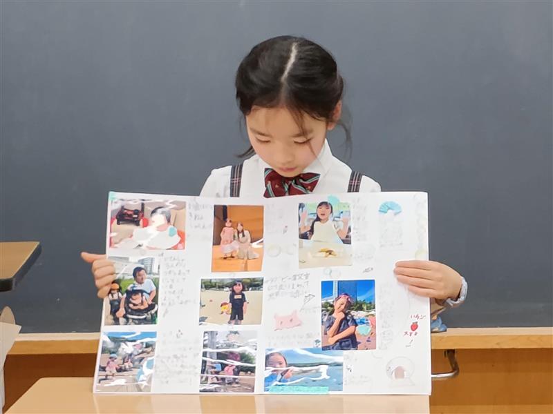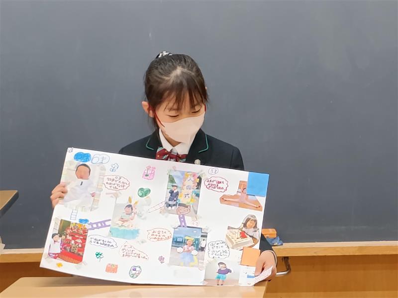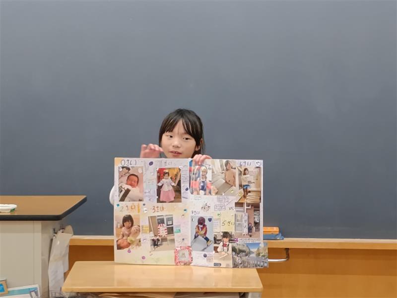 生まれた時から、2年生までの成長の記録を写真にエピソードを交えて、紹介しました。
