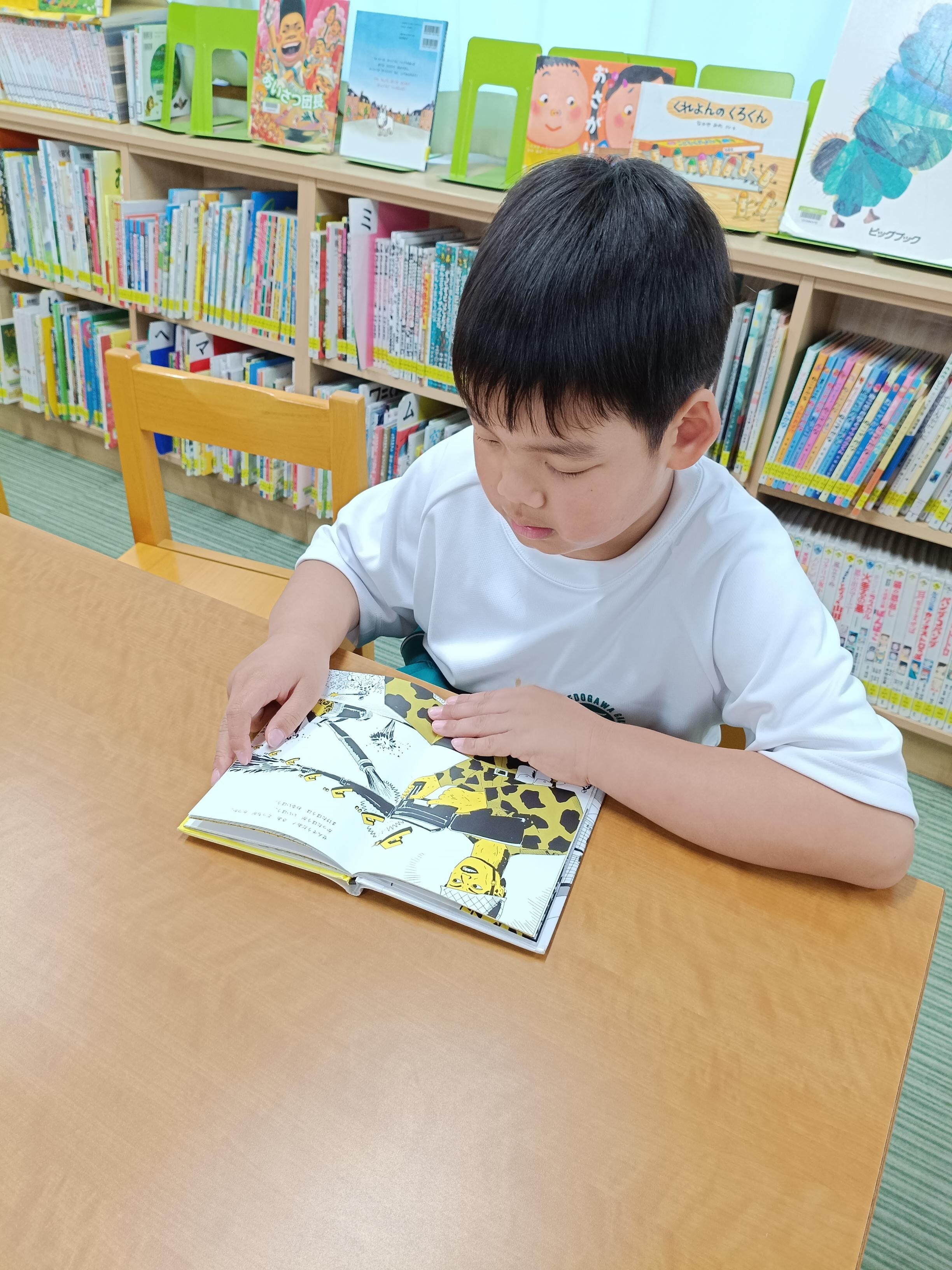 お気に入りの一冊を見つけると、椅子に座って夢中でページをめくります。1年生とは思えないほどの高い集中力で、物語の世界に没入している姿が印象的です。